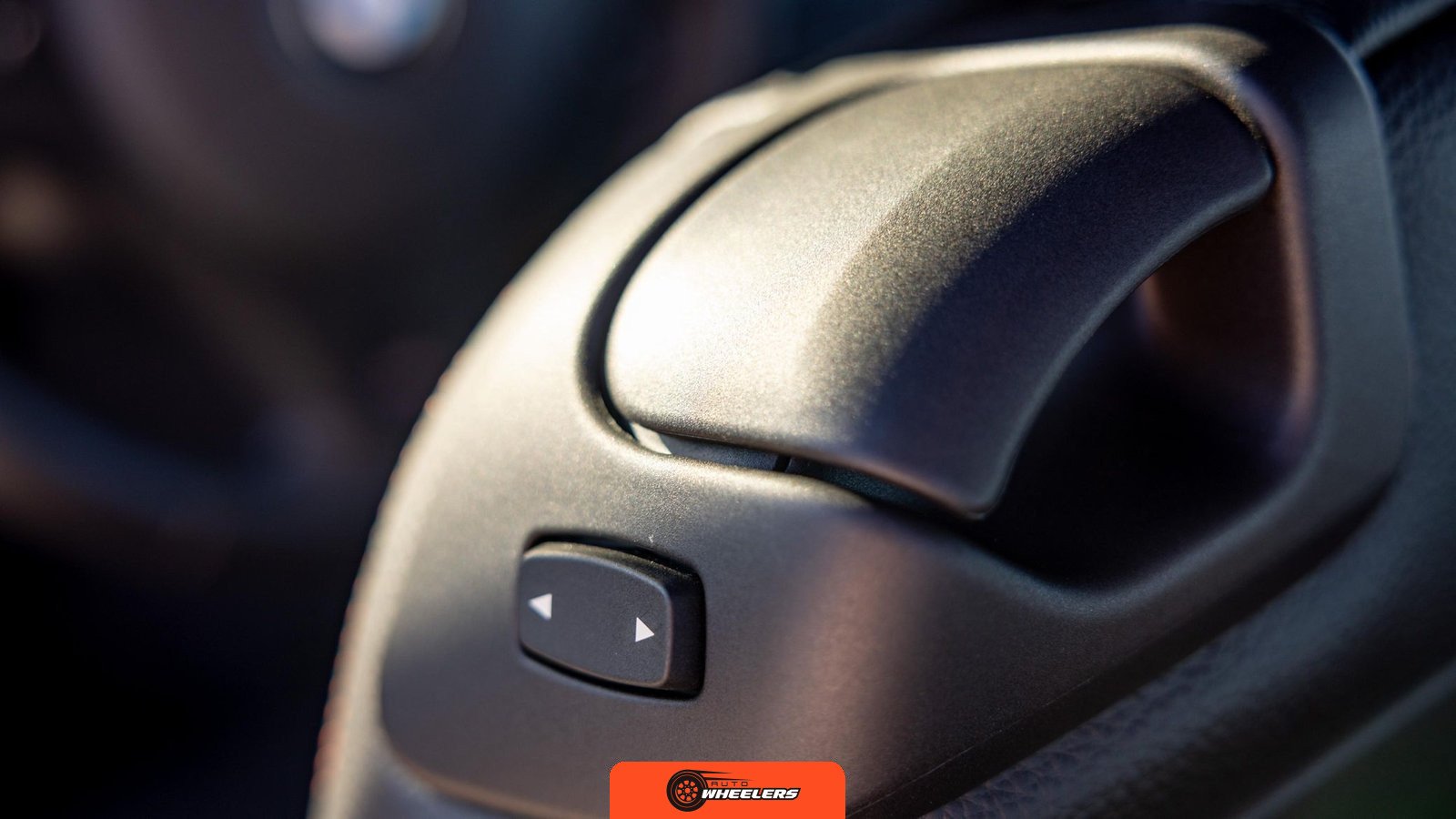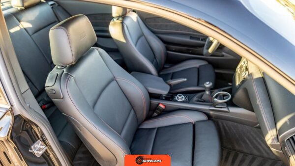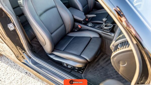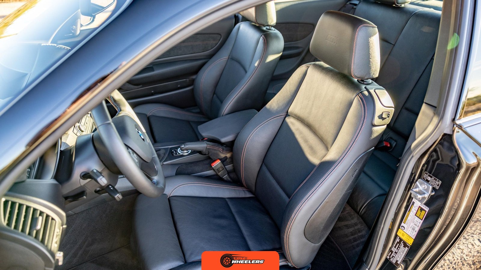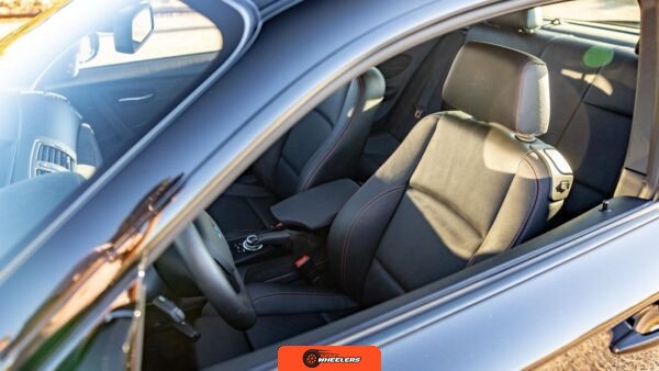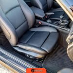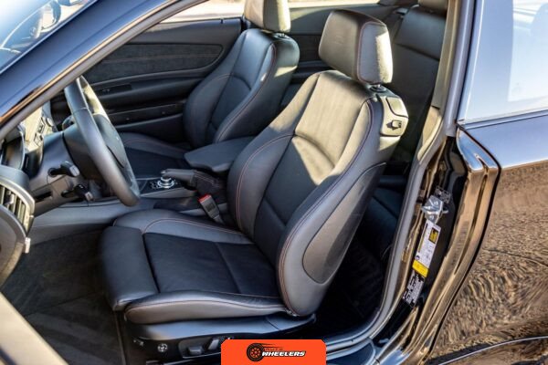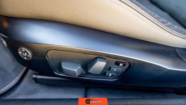 The interior consists of heated front sport seats with power adjustment and lumbar support, Alcantara trim, dual-zone automatic climate control, auto-dimming mirrors, ambient lighting, and a Harman/Kardon surround sound system. The inspection noted some creases on the driver’s outer seat bolster. Equipment includes Comfort Access keyless entry, rear parking sensors, Navigation Assist, BMW Assist with enhanced Bluetooth and USB connectivity, and an anti-theft alarm system.