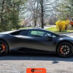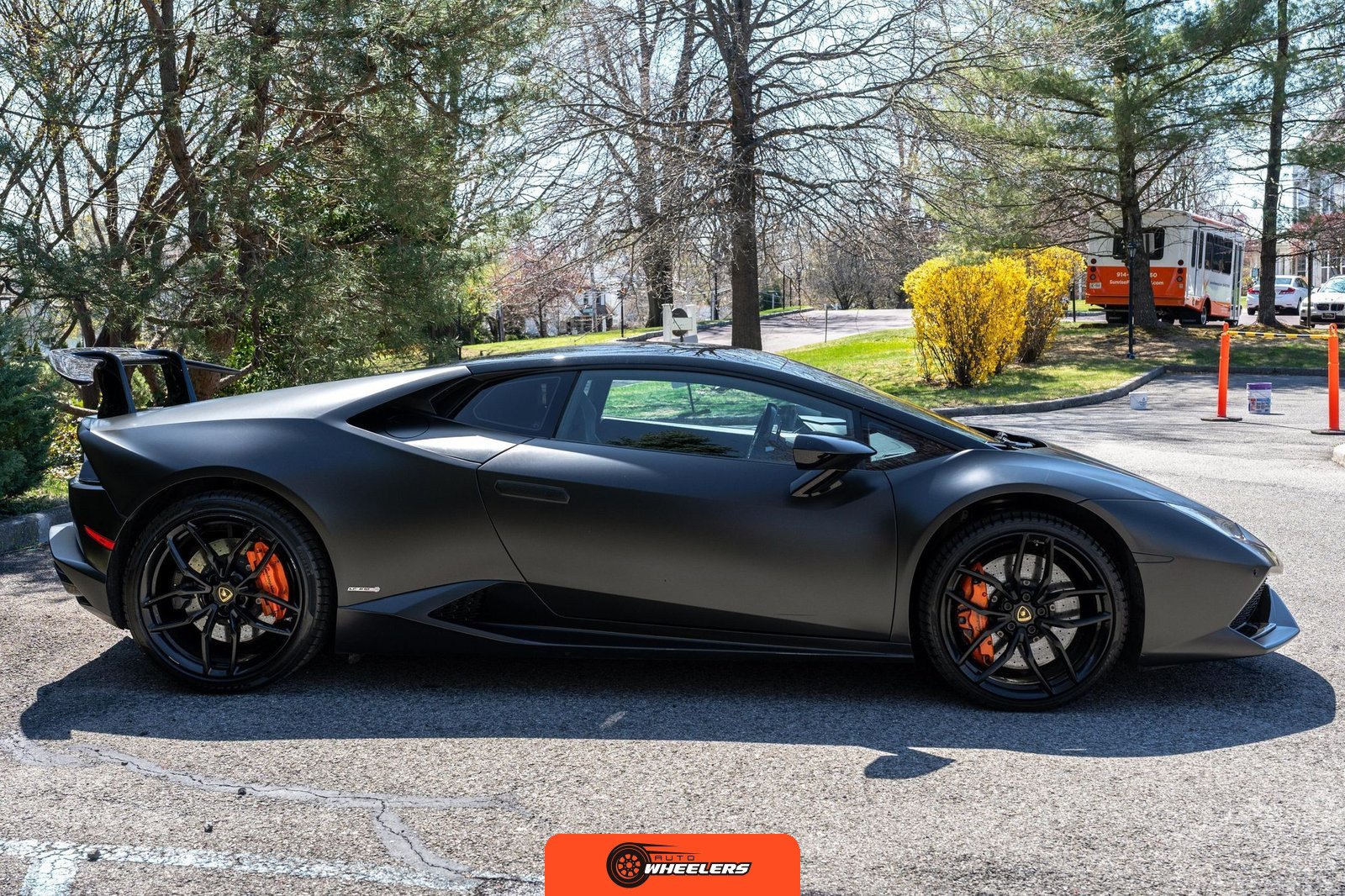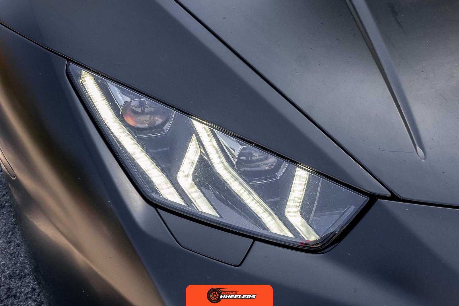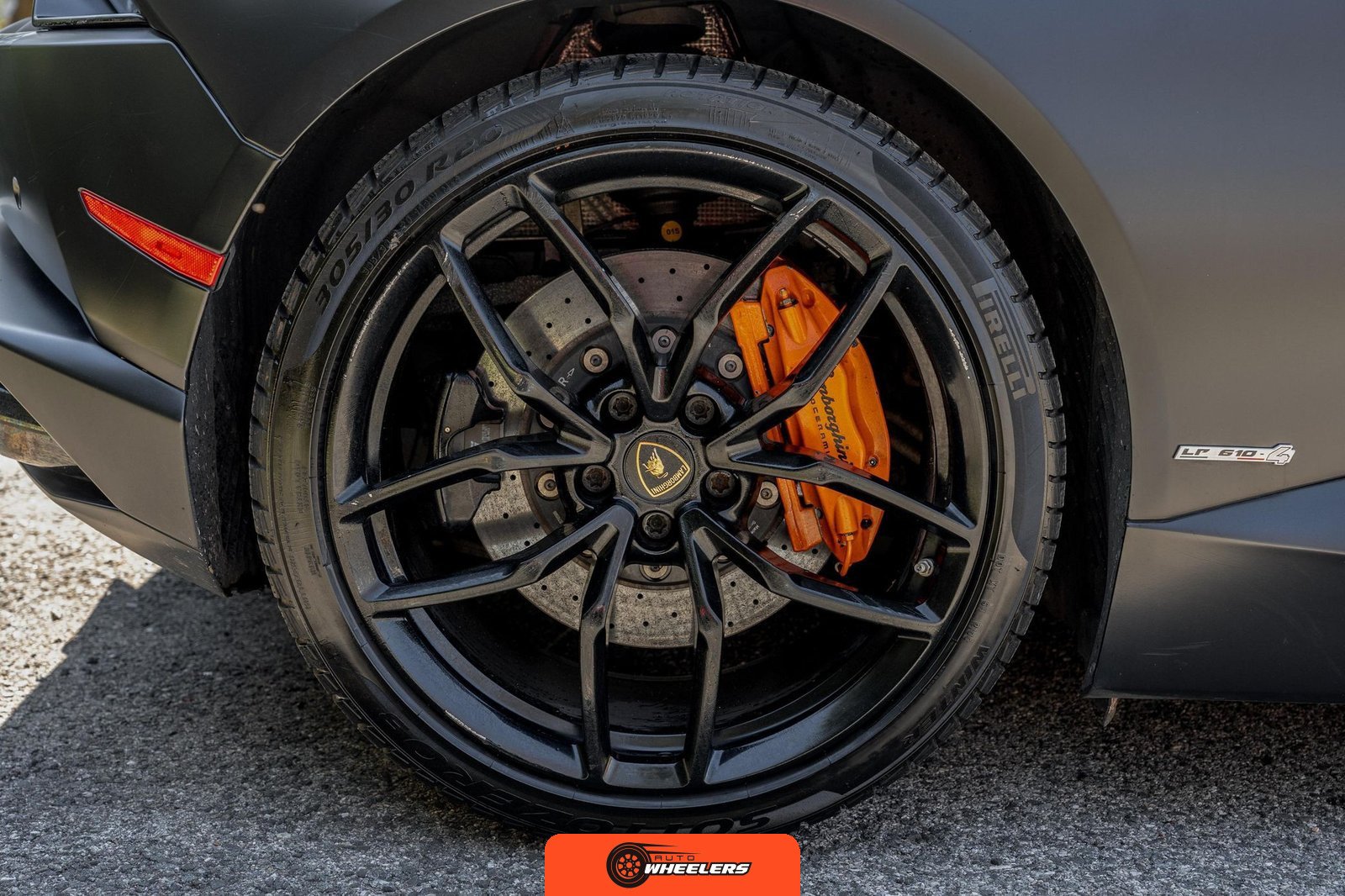 The Lamborghini Huracan LP610-4 debuted in 2015 as the successor to the Gallardo, representing the entry point into Lamborghini’s lineup while maintaining the brand’s signature mid-engine V10 configuration. The LP610-4 designation denotes the longitudinale posteriore (longitudinal rear) engine placement, 610 metric horsepower, and all-wheel-drive system. This example features the original Grigio Lynx paint beneath a matte black vinyl wrap applied by a previous owner, along with black-finished wheels and orange-painted brake calipers.