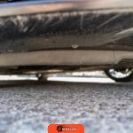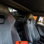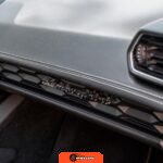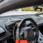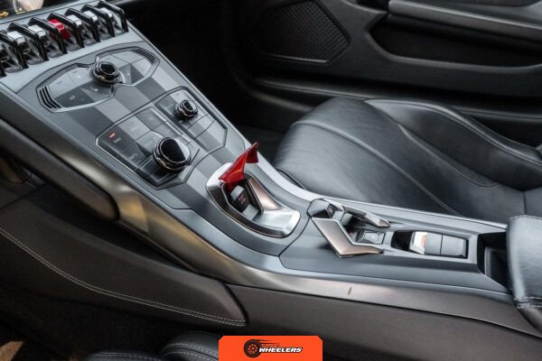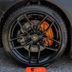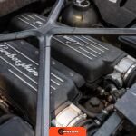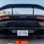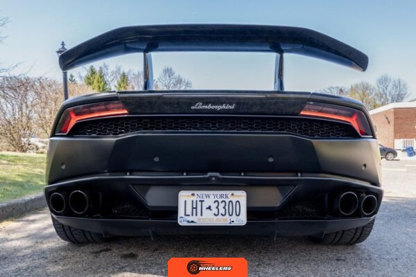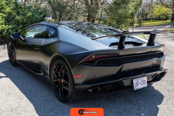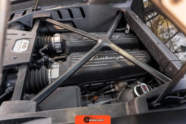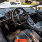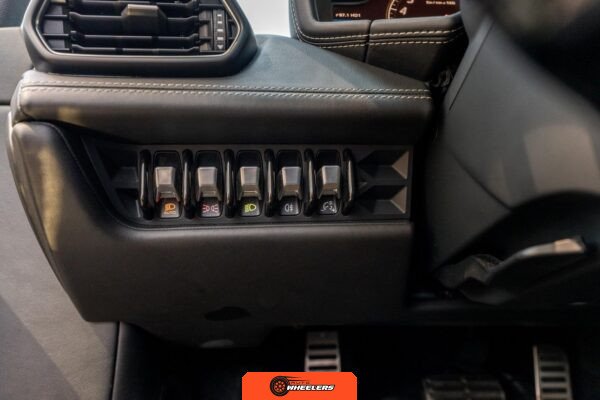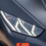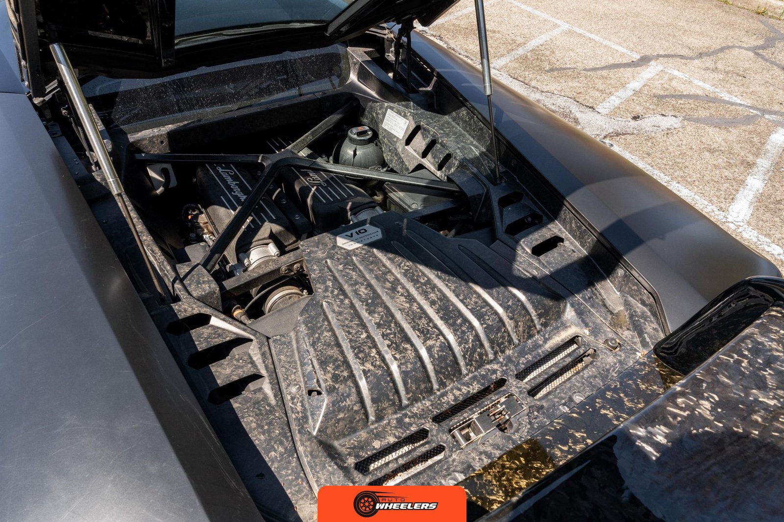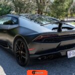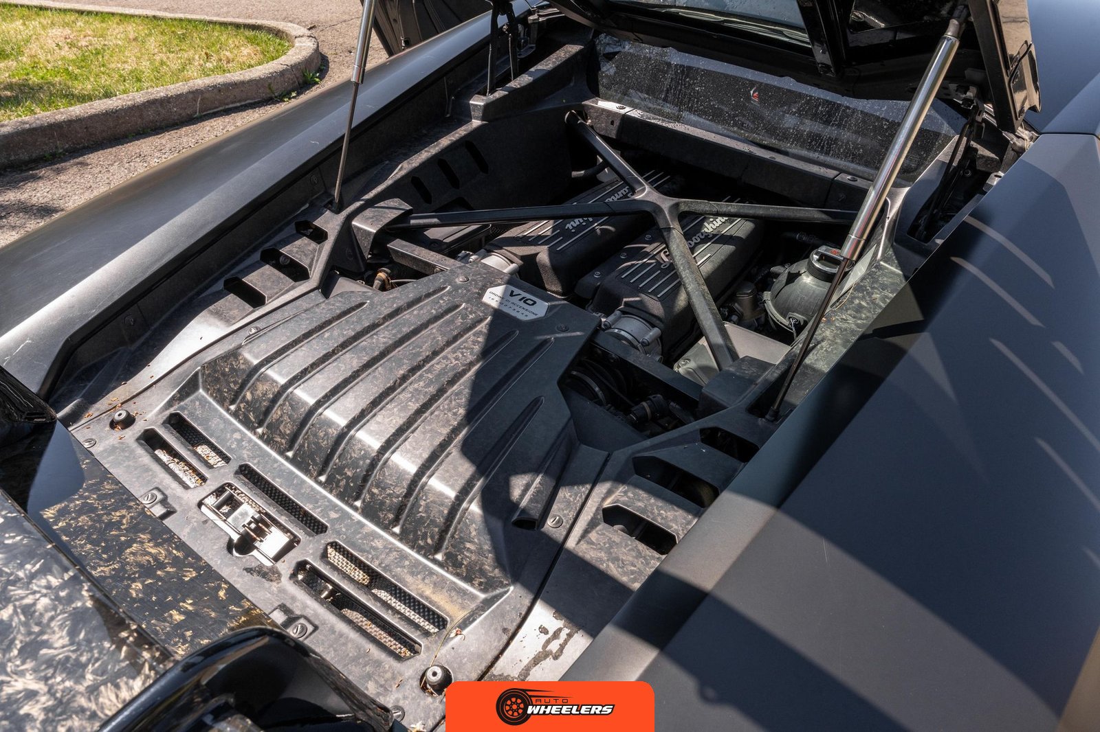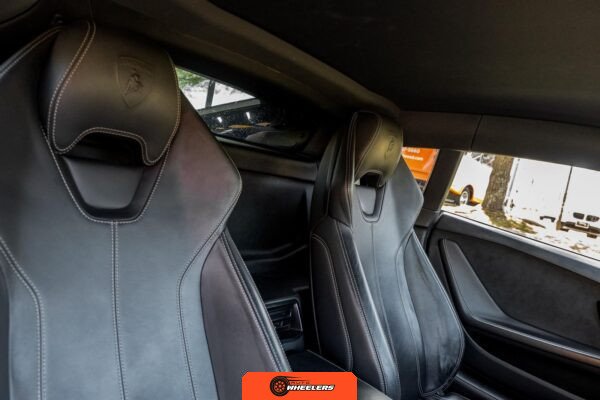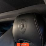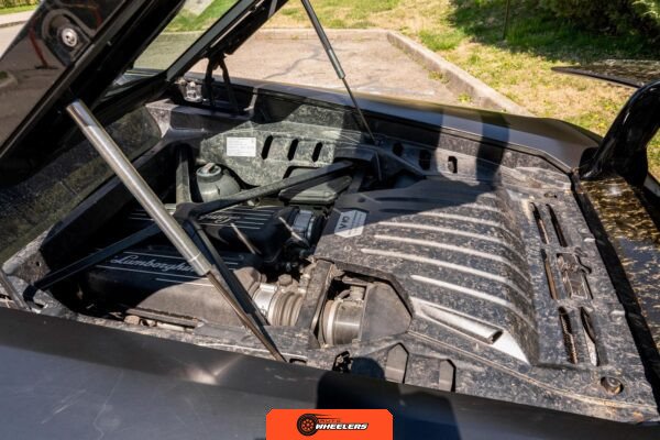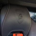 The exterior design reflects Lamborghini’s angular aesthetic language, characterized by sharp bodylines, aggressive air intakes, and a low-slung profile. The post-repossession inspection notes some imperfections around the wrap edges and minor scratching on the passenger-side rear wheel. The front axle lift system allows for ground clearance adjustment to navigate driveways and speed bumps. Tinted front side marker lights and an aftermarket rear wing represent additional modifications from the factory specification.