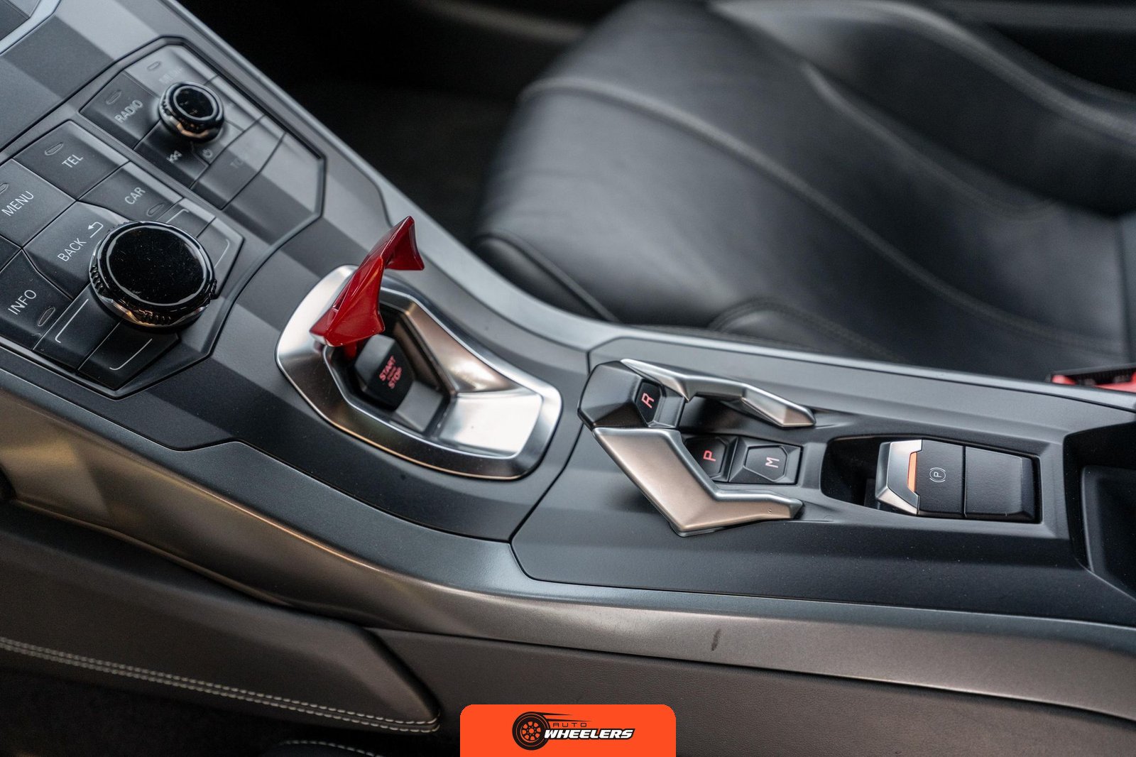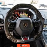 Inside, the cabin features black leather upholstery with heated and power-adjustable front seats. The driver-focused cockpit layout includes a navigation system, rearview camera, and front and rear parking sensors. An aftermarket steering wheel has been installed, deviating from the original Lamborghini component. The inspection report indicates some wear on the seating surfaces consistent with the recorded mileage. The instrument cluster currently displays a “lightbulb out” warning icon.