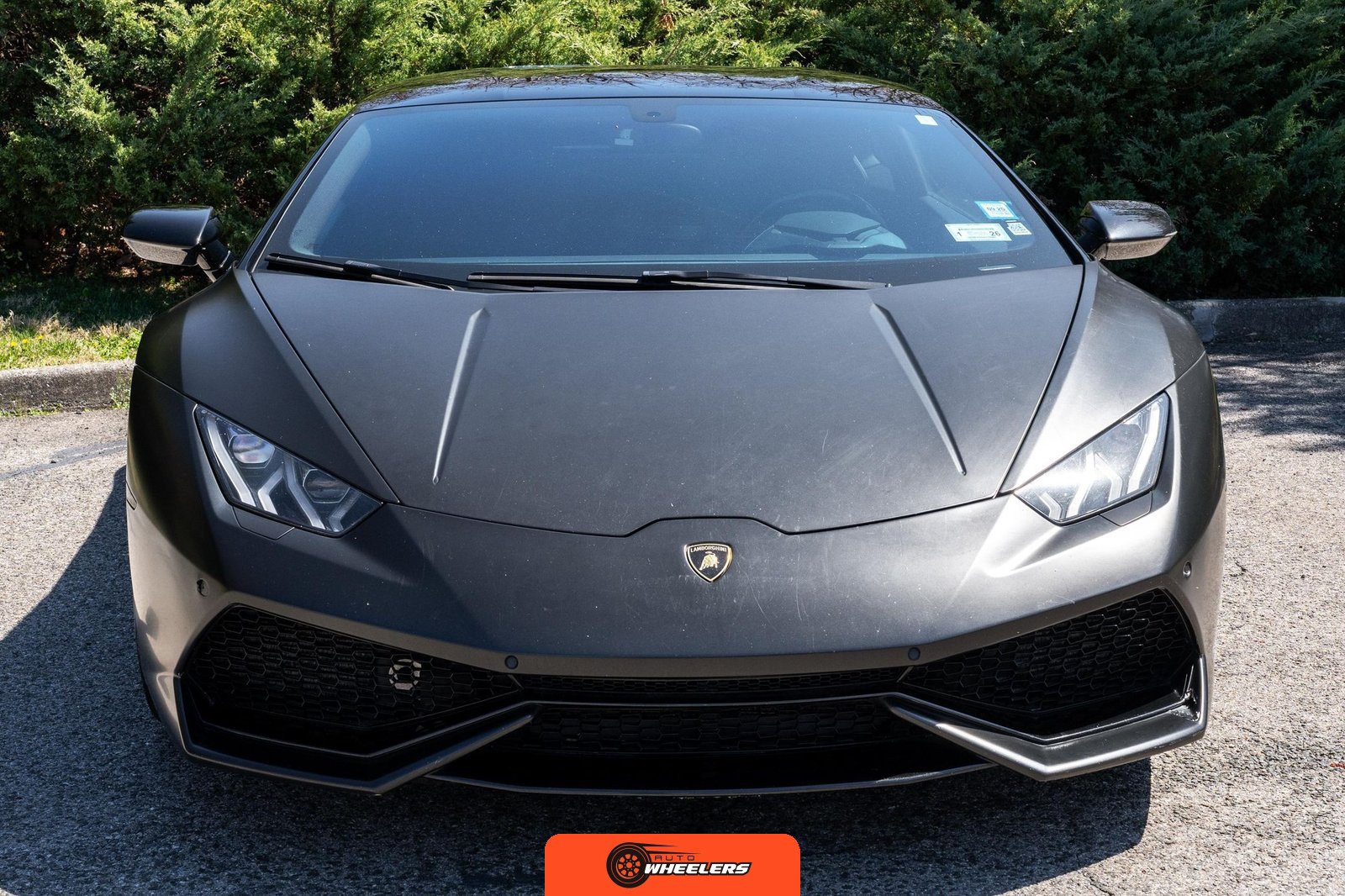 This is a 2015 Lamborghini Huracan LP610-4 coupe finished in Grigio Lynx with a matte black vinyl wrap over a black leather interior. It is offered as a repossessed asset and has undergone a post-repossession inspection.