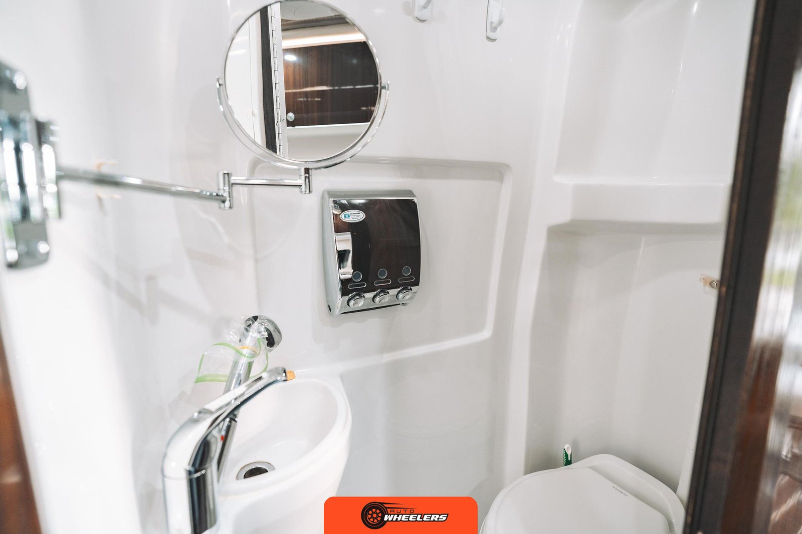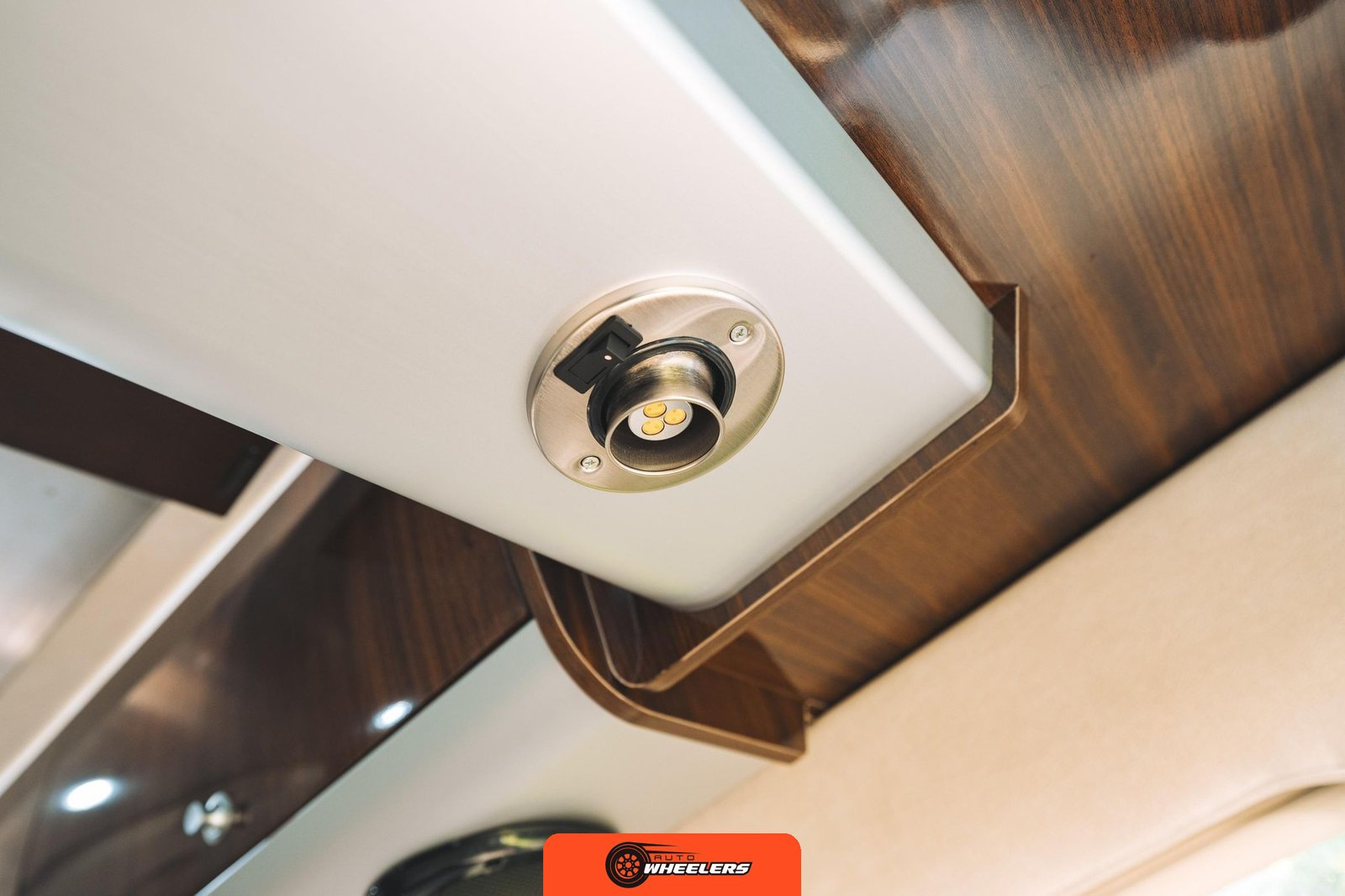 The interior reflects Airstream’s attention to luxury touring comfort with Ultraleather upholstery throughout and Magic Suede wall coverings. The living space features a power-adjustable rear sofa with additional seating, high-gloss laminate cabinetry with flush-mounted cabinets, and a built-in workstation. The galley includes a DuPont Corian countertop with backsplash, sink with integrated cover, cooktop with integrated cover, refrigerator, and microwave. The bathroom compartment houses a toilet, one-piece shower, and sink with articulated mirror, complemented by a retractable clothesline and towel rack.