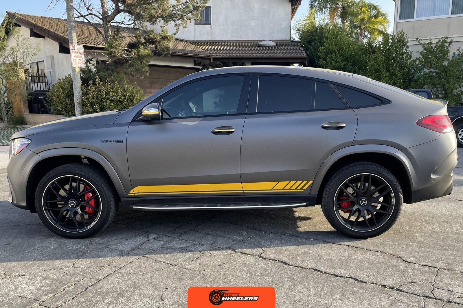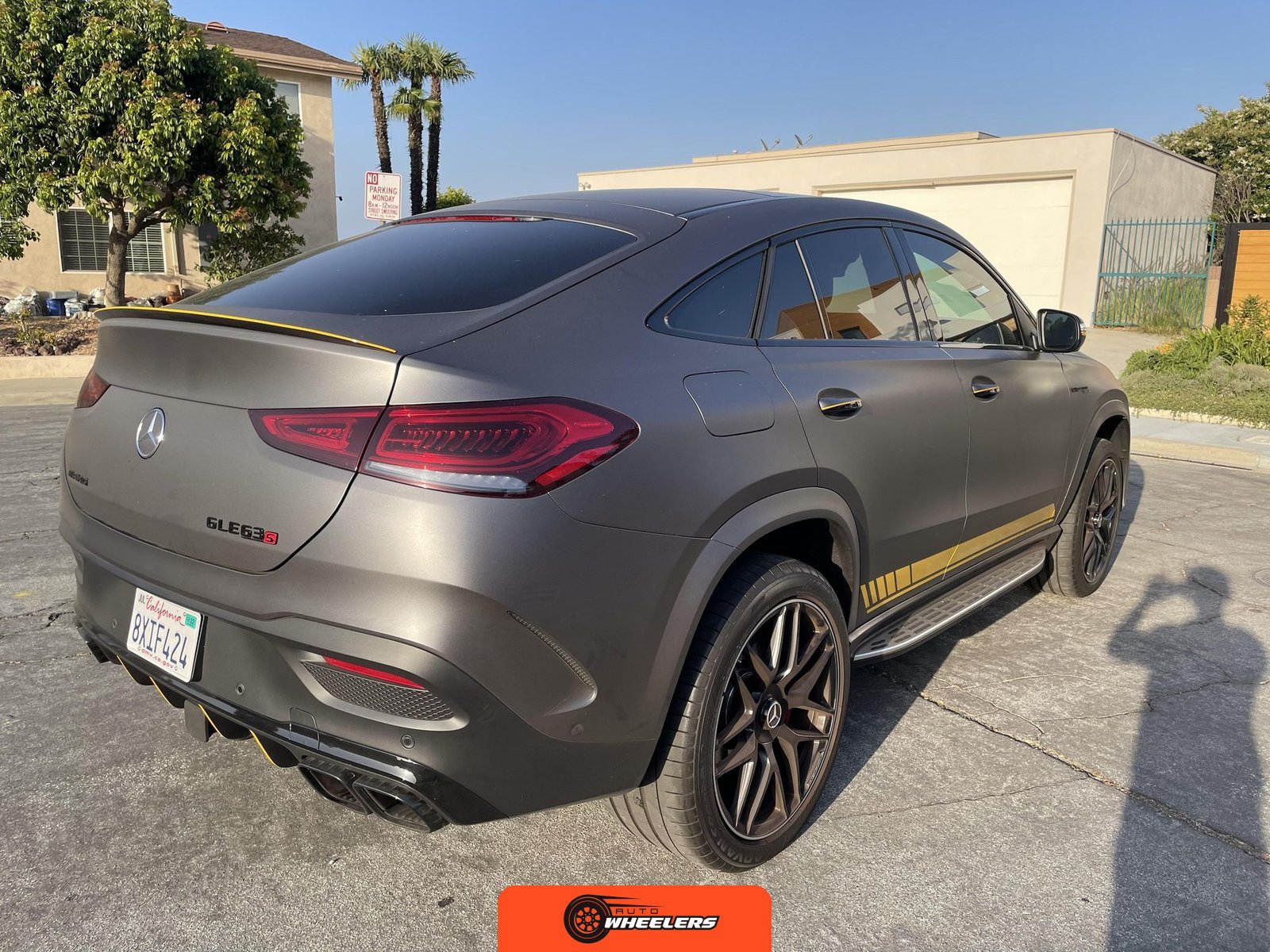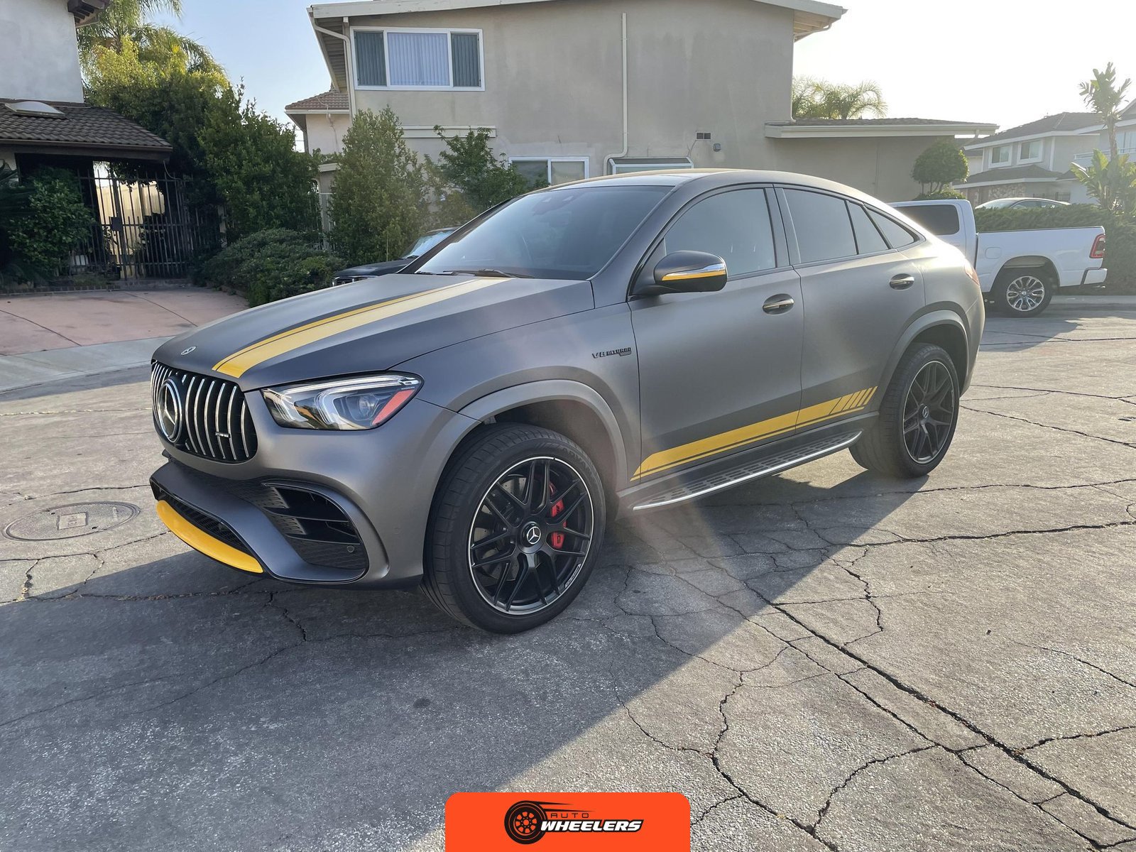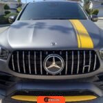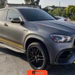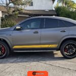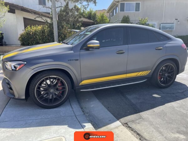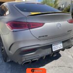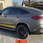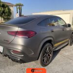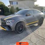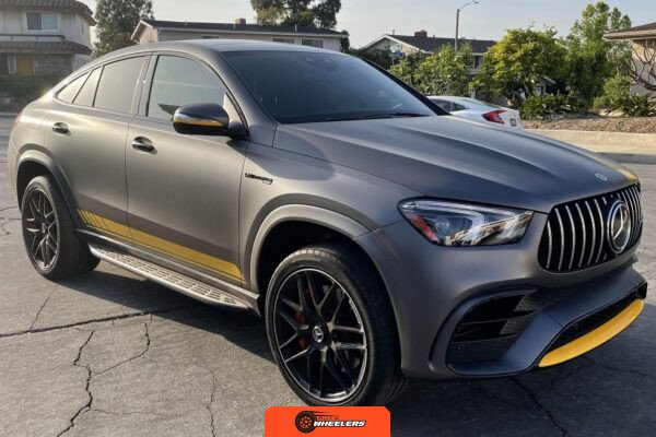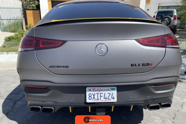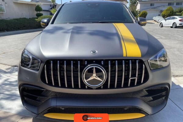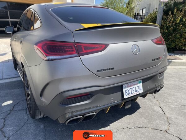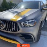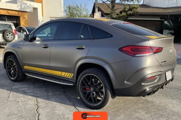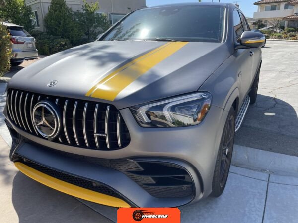 The 2021 Mercedes-AMG GLE63 S Coupe represents the high-performance variant of Mercedes-Benz’s mid-size luxury SUV lineup, combining coupe-like styling with AMG engineering. This example is configured with the AMG Night Package, which includes gloss black exterior accents such as the front splitter, apron trim strips, window trim, exterior mirror caps, AMG exhaust system, and twin tailpipes finished in black chrome. The exterior rides on 22-inch AMG forged wheels and features a coupe-inspired roofline with a panoramic glass roof. The post-repossession inspection identified a 3M matte grey vinyl wrap with yellow accents covering the factory Obsidian Black Metallic finish.