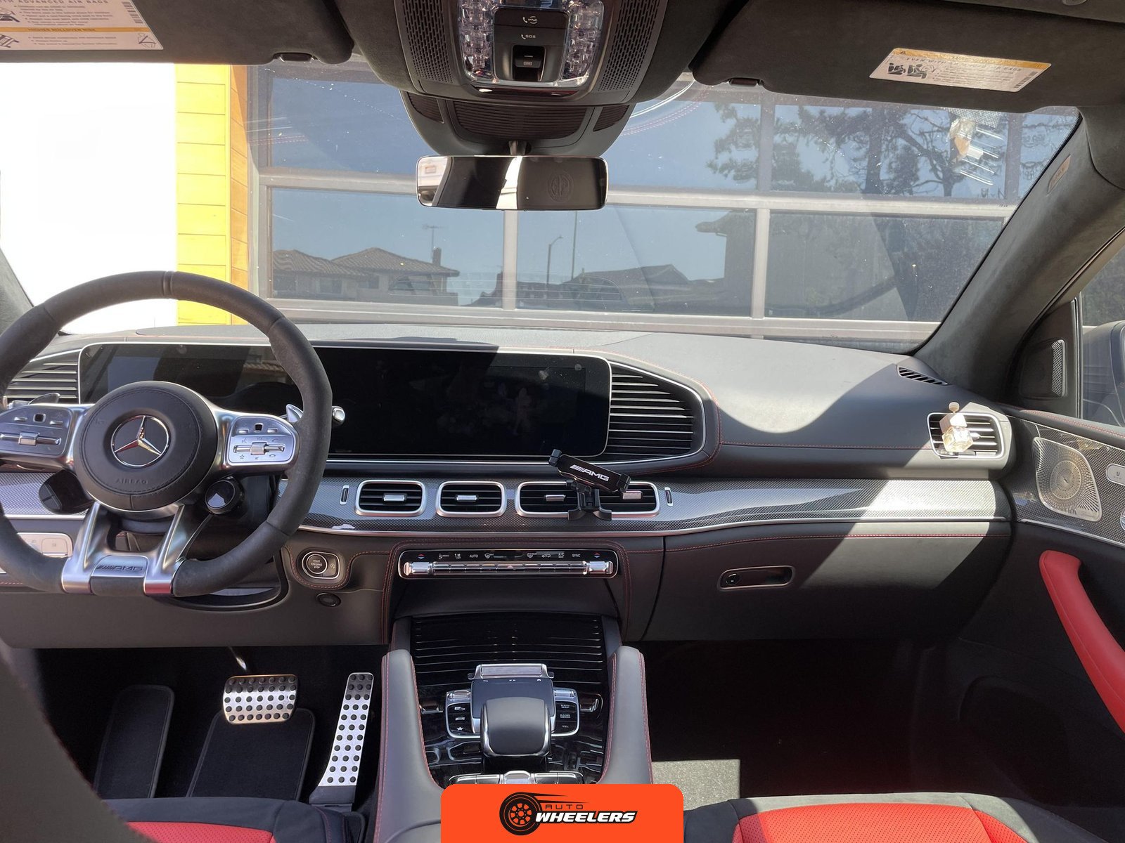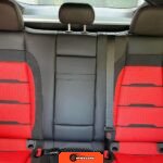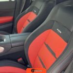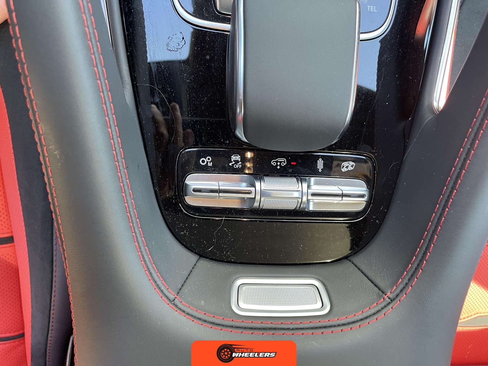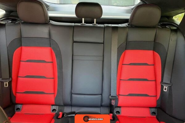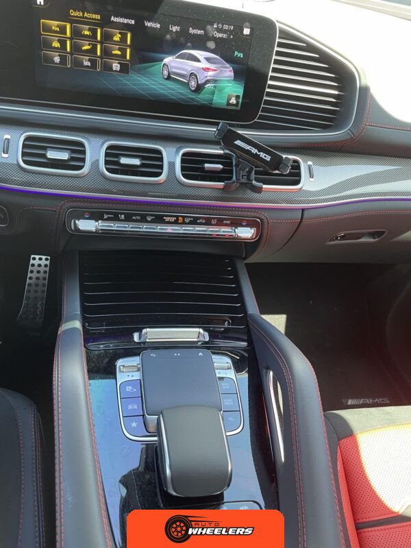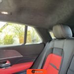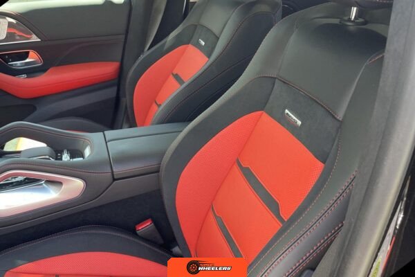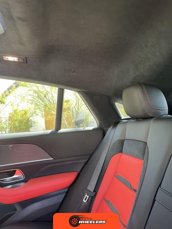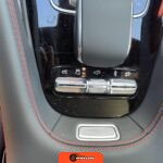 The interior features Nappa leather upholstery in a red and black color scheme with metal weave trim elements. The front seats are power-adjustable with heating, ventilation, and rapid heating functionality. The Warmth and Comfort Package adds heated front armrests and door panels. The cabin is equipped with a 12.3-inch digital instrument cluster and a 12.3-inch touchscreen display running Mercedes-Benz’s MBUX infotainment system with navigation, Apple CarPlay, and Android Auto compatibility. Additional interior features include dual-zone automatic climate control, 64-color ambient lighting, wireless smartphone charging, and a Burmester Surround Sound audio system. The inspection noted creases on the driver seat cushion.