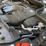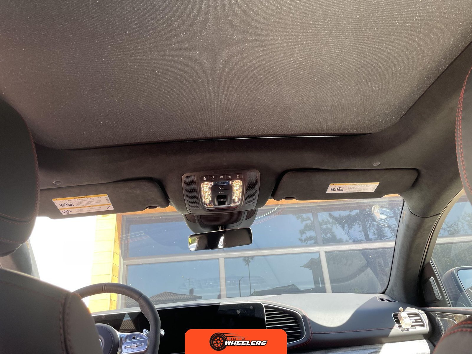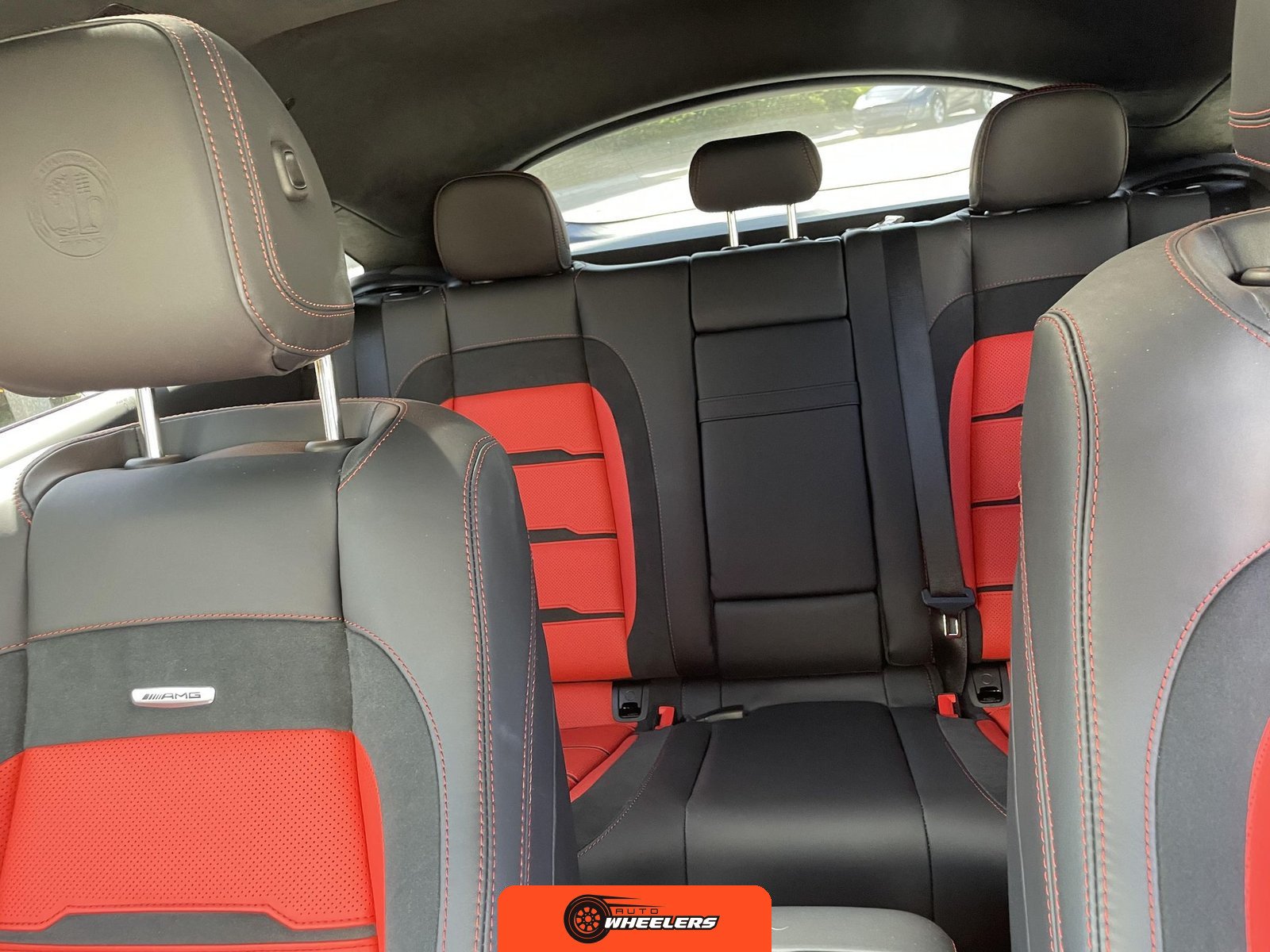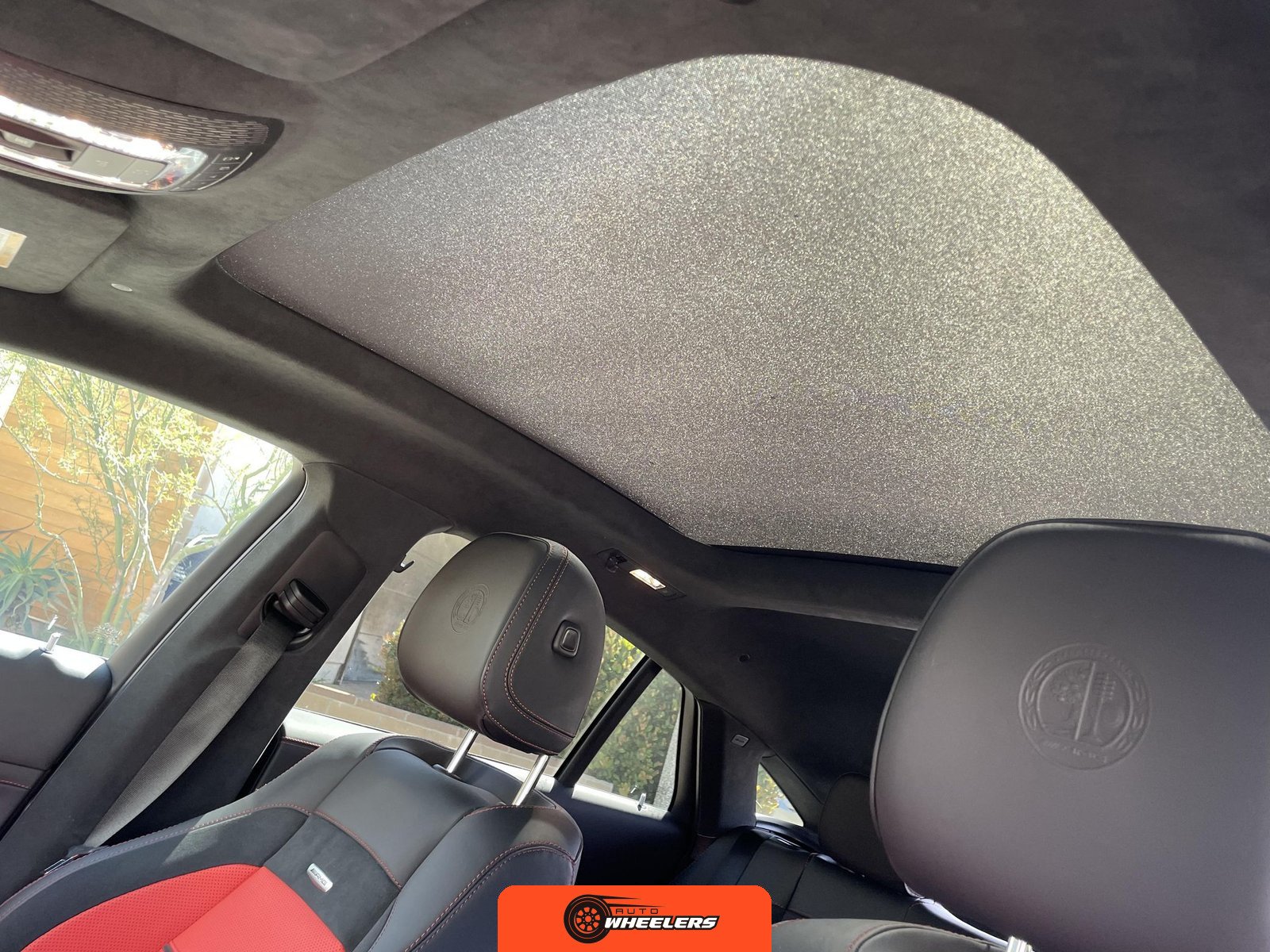 The interior features Nappa leather upholstery in a red and black color scheme with metal weave trim elements. The front seats are power-adjustable with heating, ventilation, and rapid heating functionality. The Warmth and Comfort Package adds heated front armrests and door panels. The cabin is equipped with a 12.3-inch digital instrument cluster and a 12.3-inch touchscreen display running Mercedes-Benz’s MBUX infotainment system with navigation, Apple CarPlay, and Android Auto compatibility. Additional interior features include dual-zone automatic climate control, 64-color ambient lighting, wireless smartphone charging, and a Burmester Surround Sound audio system. The inspection noted creases on the driver seat cushion.