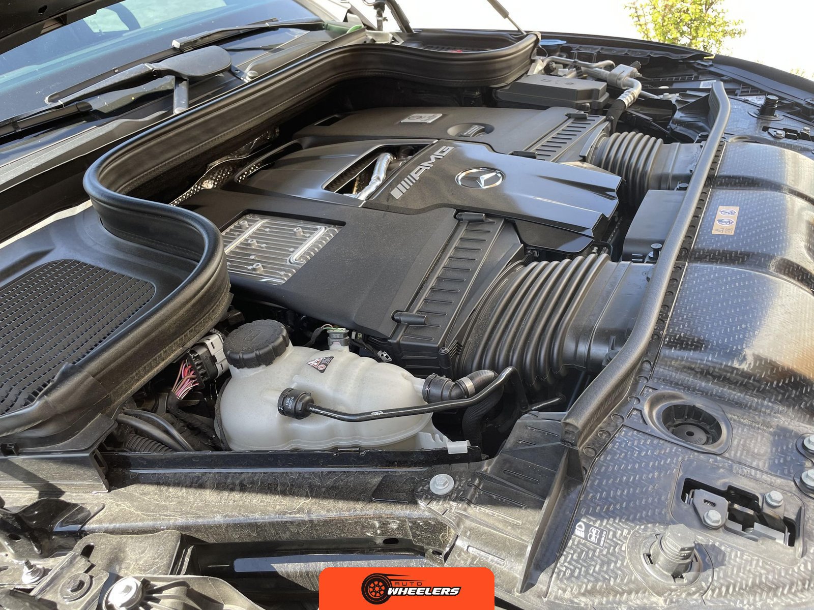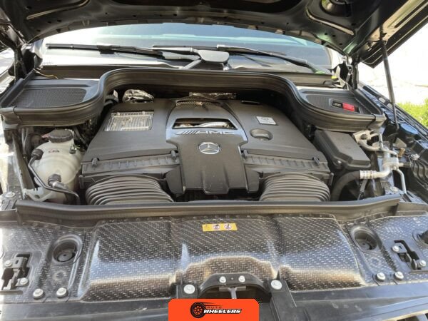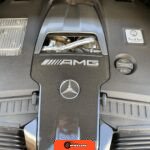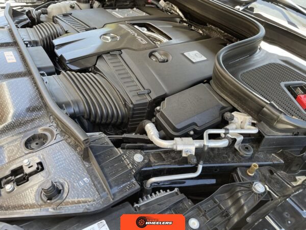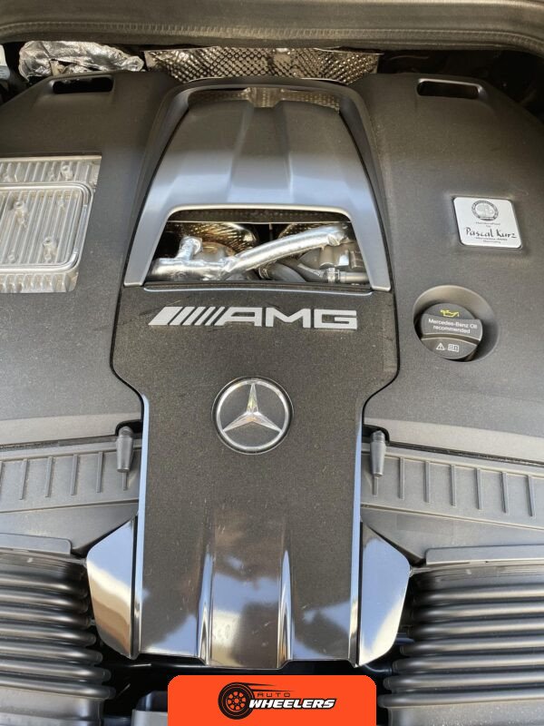 The powertrain consists of a hand-built 4.0-liter twin-turbocharged V8 engine mated to a nine-speed automatic transmission with all-wheel drive. Performance-oriented mechanical components include AMG Active Ride Control suspension, an AMG electronic limited-slip differential, and active dynamic engine mounts. A factory trailer hitch is installed.