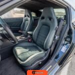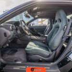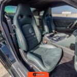 Inside, the cabin features Mori Green upholstery executed in hand-stitched semi-aniline leather. The front seats combine semi-aniline leather and suede surfaces and are both heated and power-adjustable. A quilted Alcantara headliner, carbon fiber interior trim, and T-spec emblems distinguish this configuration from standard GT-R models. The driver-focused layout includes an 8-inch display for the NissanConnect infotainment system with navigation and Apple CarPlay compatibility, an 11-speaker Bose sound system, and technologies such as Active Sound Enhancement and Active Noise Cancellation. Additional convenience features include heated, power-adjustable, and power-folding door mirrors, a rear-view camera, and front and rear parking sensors.
