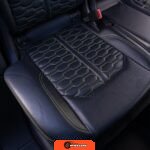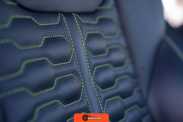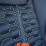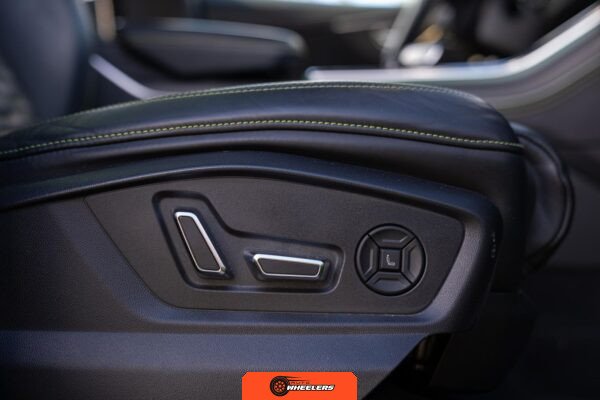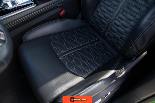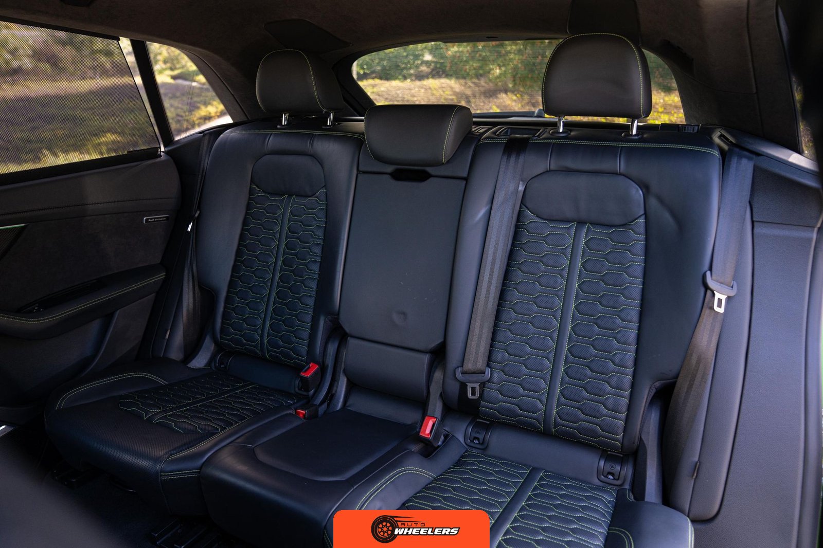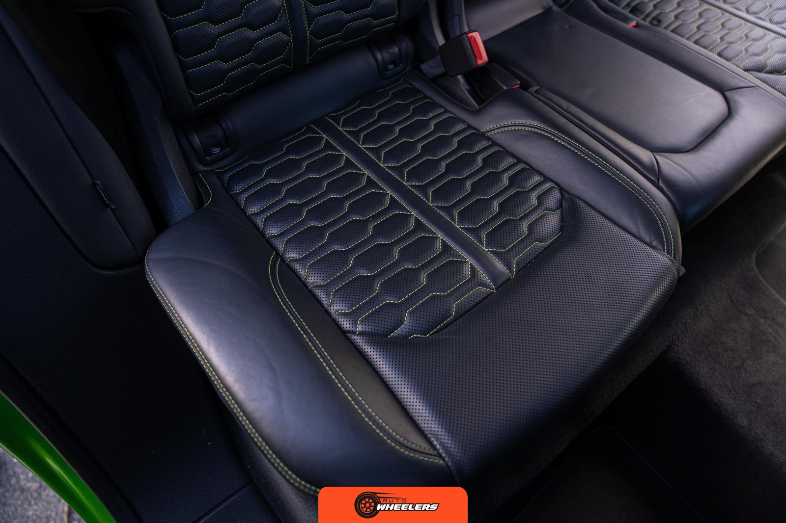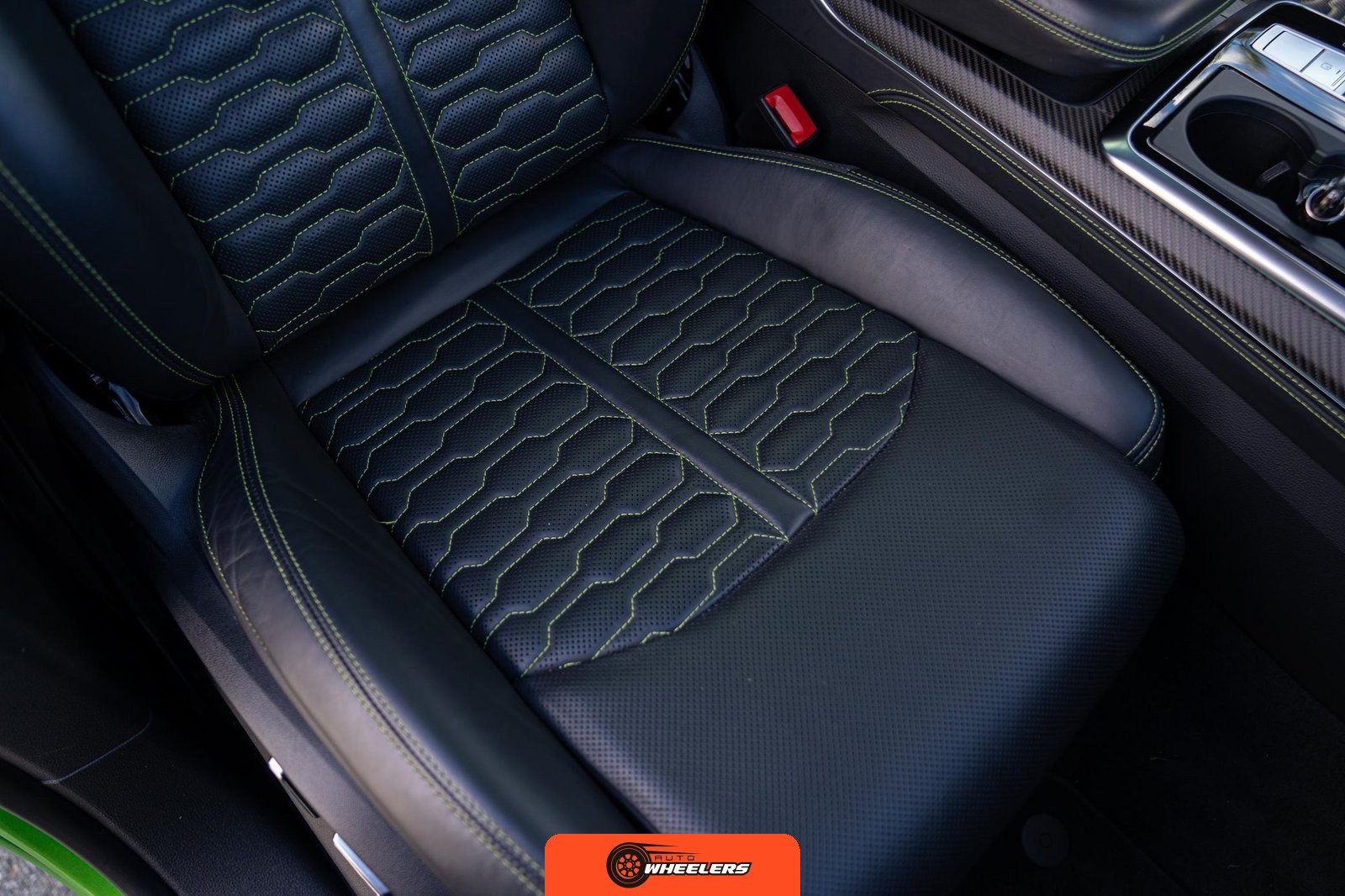 Inside, the cabin features black leather upholstery with contrasting Iguana Green stitching that complements the exterior finish. The Luxury Package provides a massage function for the front seats, sunshades for the rear side and tailgate windows, an extended leather package, and an Alcantara headliner. The Executive Package adds dual-pane acoustic glass, power soft-closing doors, a head-up display, and heated rear seats. Carbon twill matte inlays accent the interior surfaces. The inspection identified creases on the front seat bolsters, indents in the rear seats, and sticker residue on the front passenger footwell carpeting.
