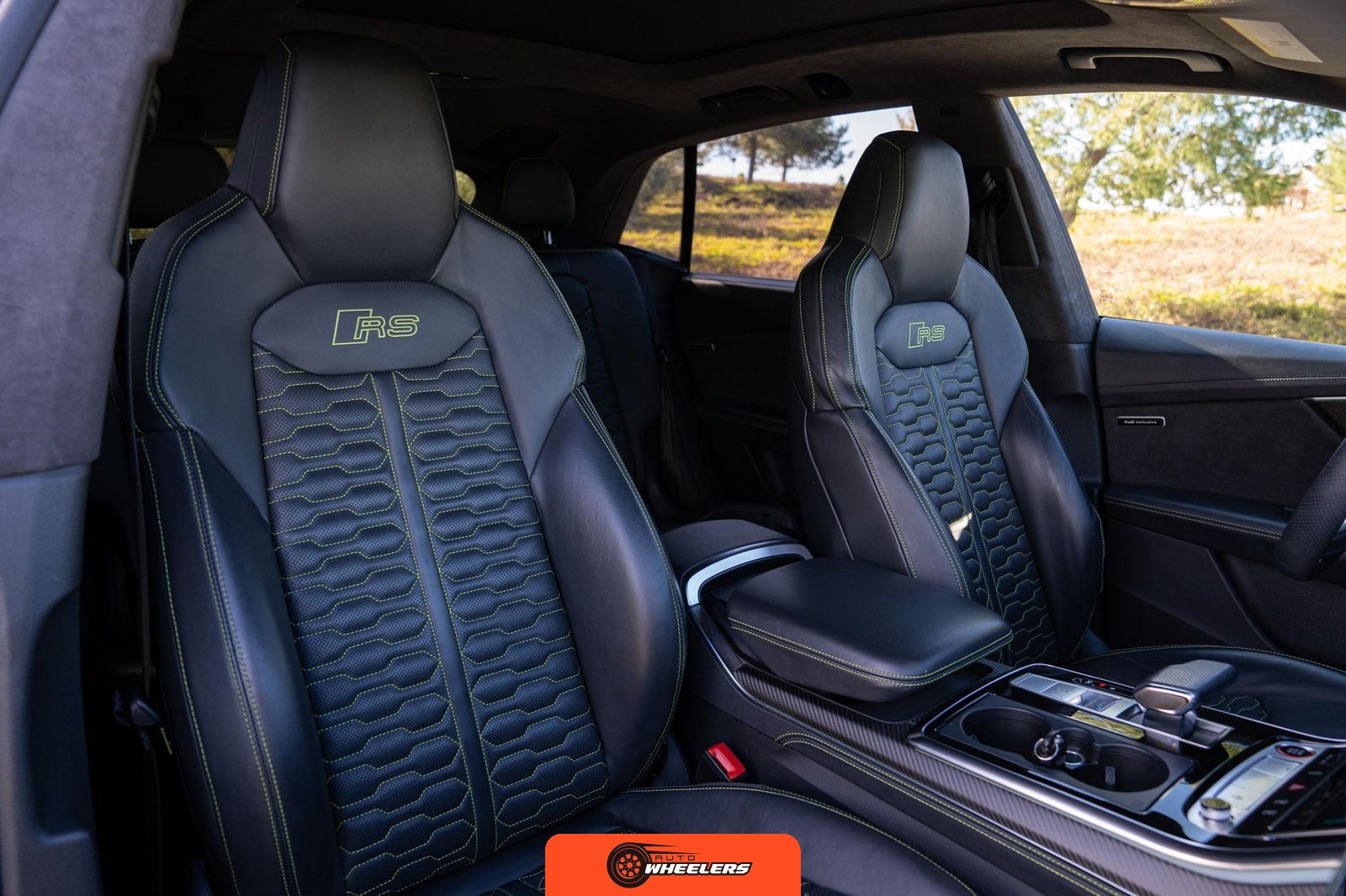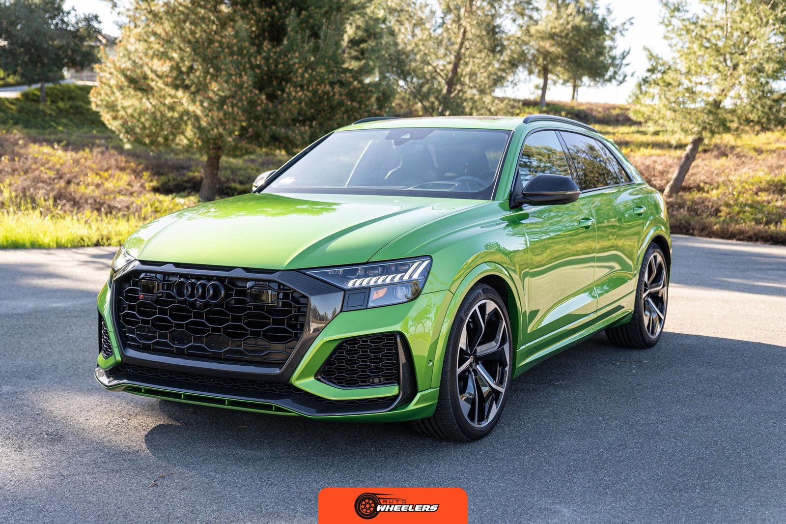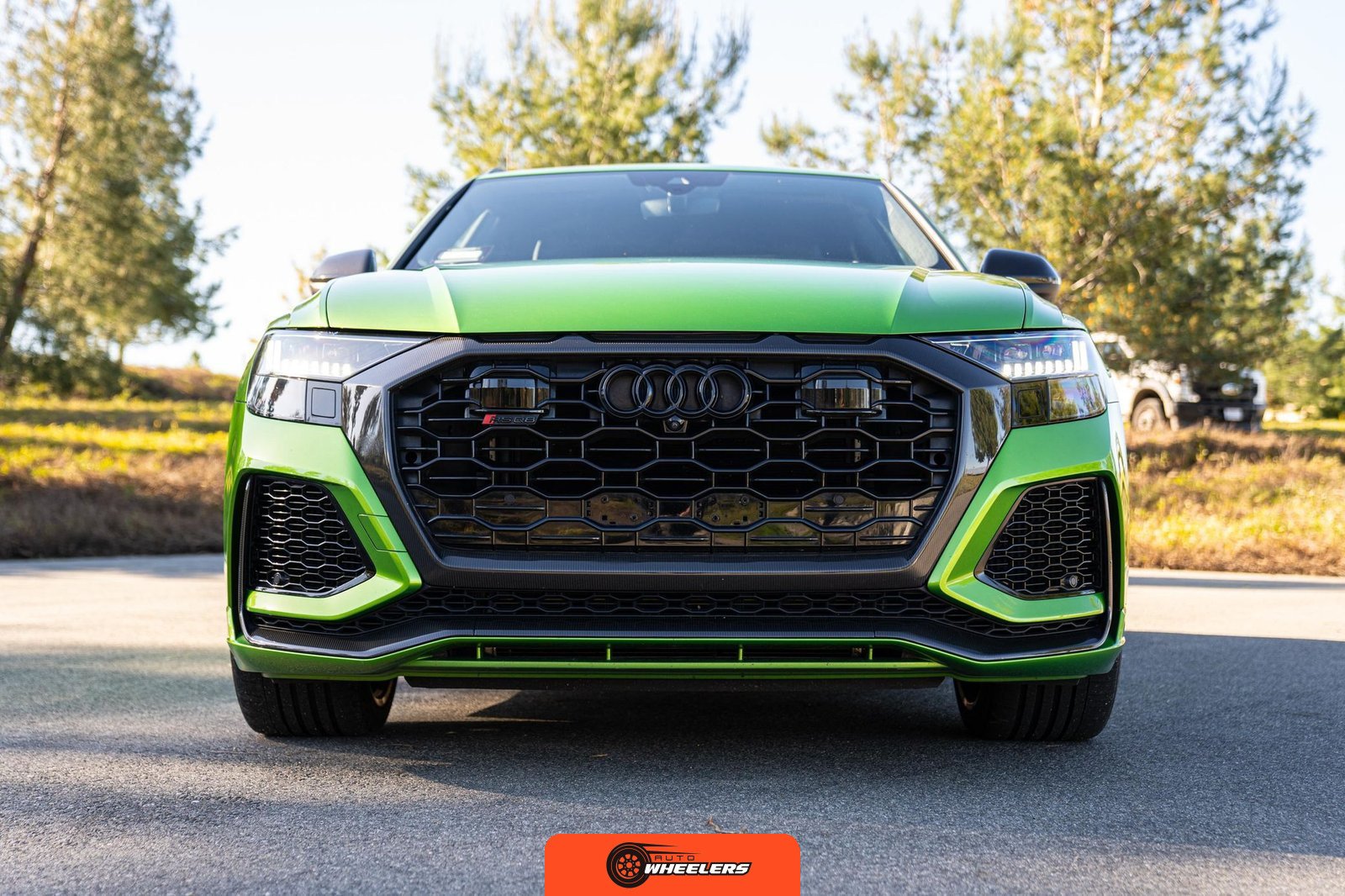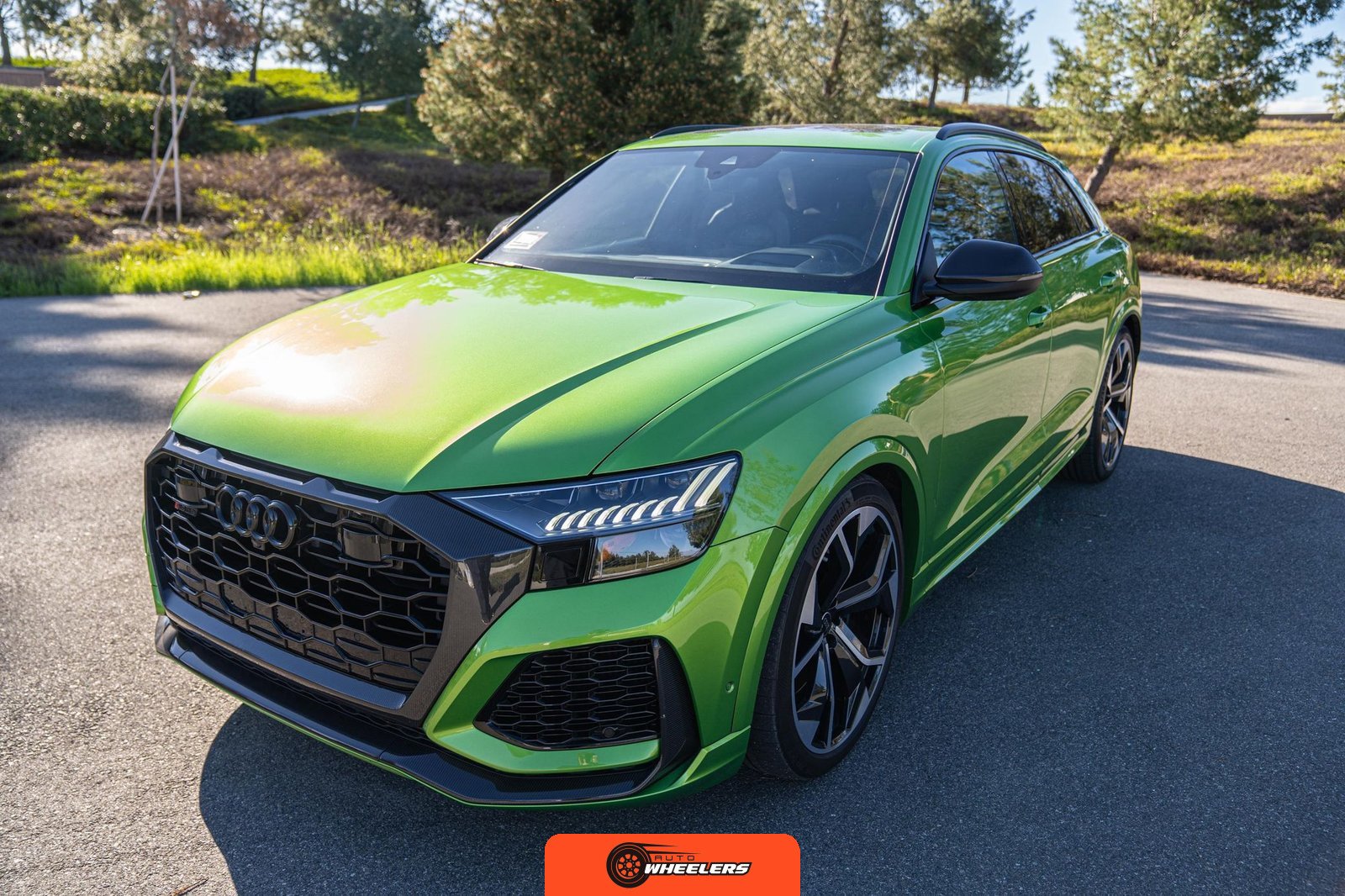 The exterior of this RS Q8 is finished in Audi Exclusive Java Green, a special-order color that distinguishes it from standard production offerings. The Carbon Optic Package adds carbon fiber exterior mirror caps, carbon exterior elements, and a carbon mask. The Black Optic Package contributes black Audi rings and badges, black roof rails, a black mask, high-gloss black exterior elements, and 23-inch 5-Y-spoke-rotor design anthracite wheels. A sport exhaust system is also included as part of the Black Optic Package. The post-repossession inspection noted stone chips on the front end consistent with highway use.