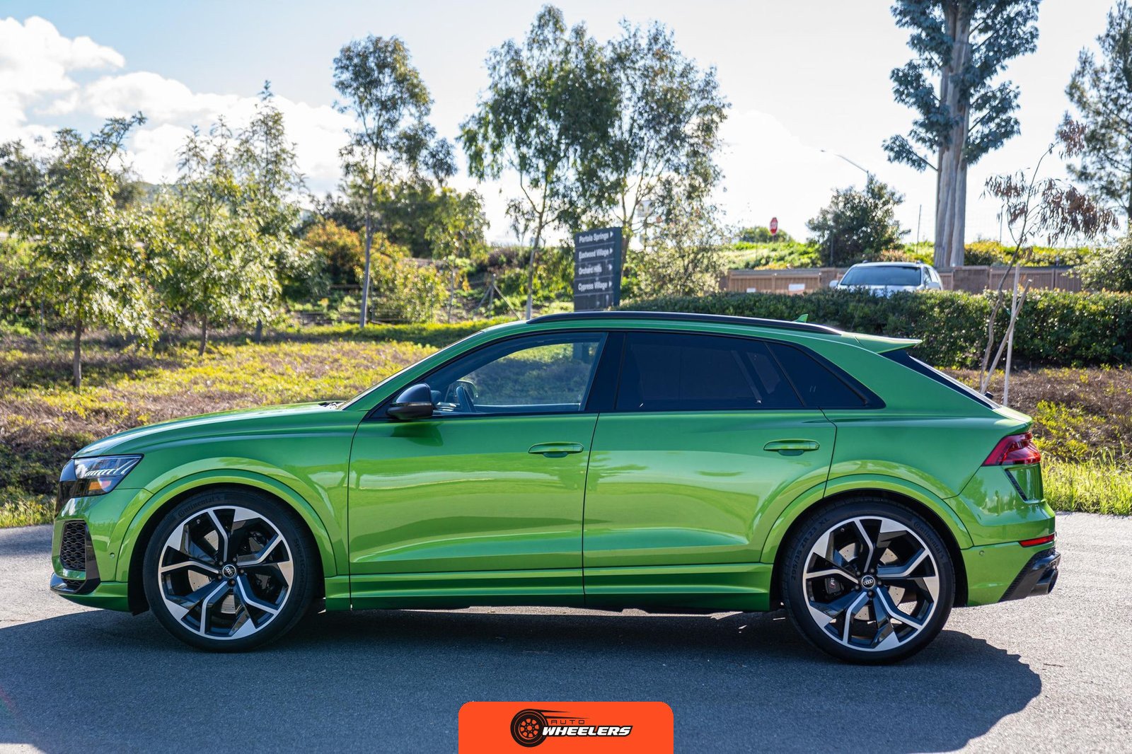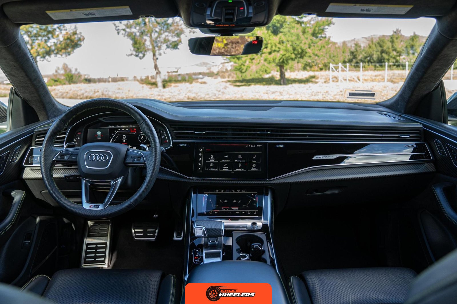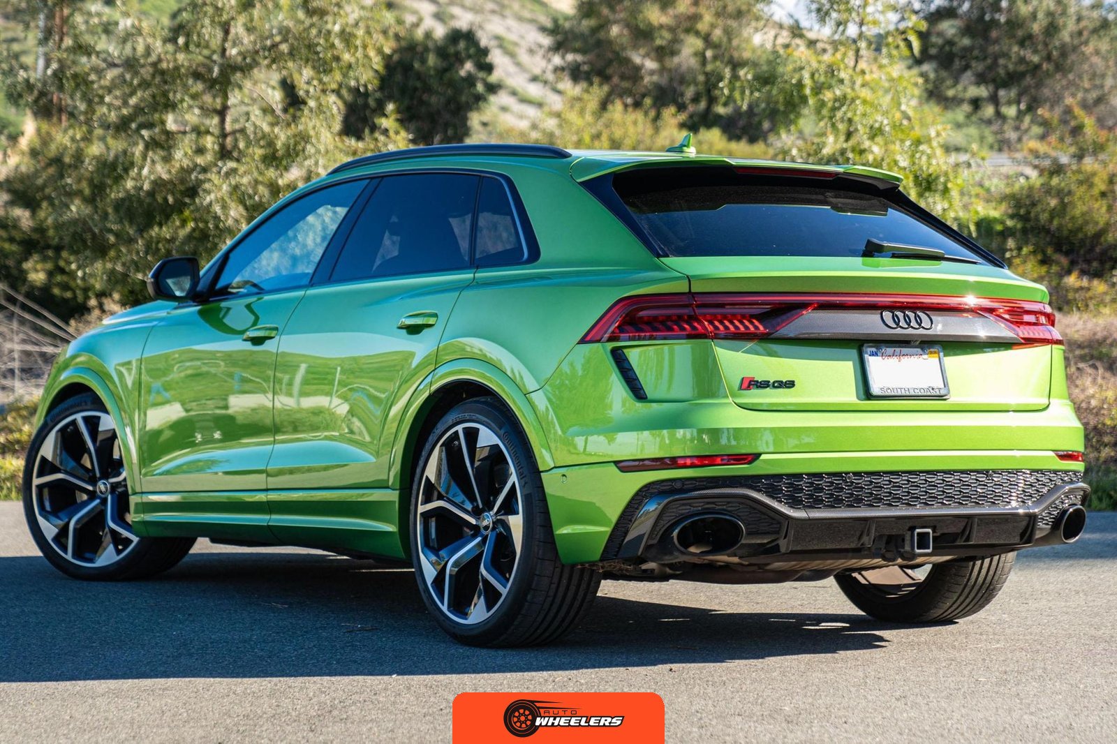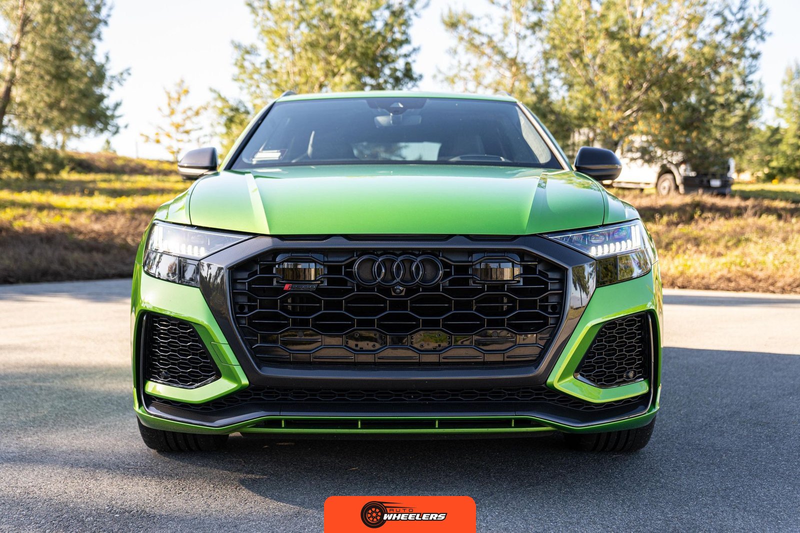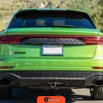 The exterior of this RS Q8 is finished in Audi Exclusive Java Green, a special-order color that distinguishes it from standard production offerings. The Carbon Optic Package adds carbon fiber exterior mirror caps, carbon exterior elements, and a carbon mask. The Black Optic Package contributes black Audi rings and badges, black roof rails, a black mask, high-gloss black exterior elements, and 23-inch 5-Y-spoke-rotor design anthracite wheels. A sport exhaust system is also included as part of the Black Optic Package. The post-repossession inspection noted stone chips on the front end consistent with highway use.