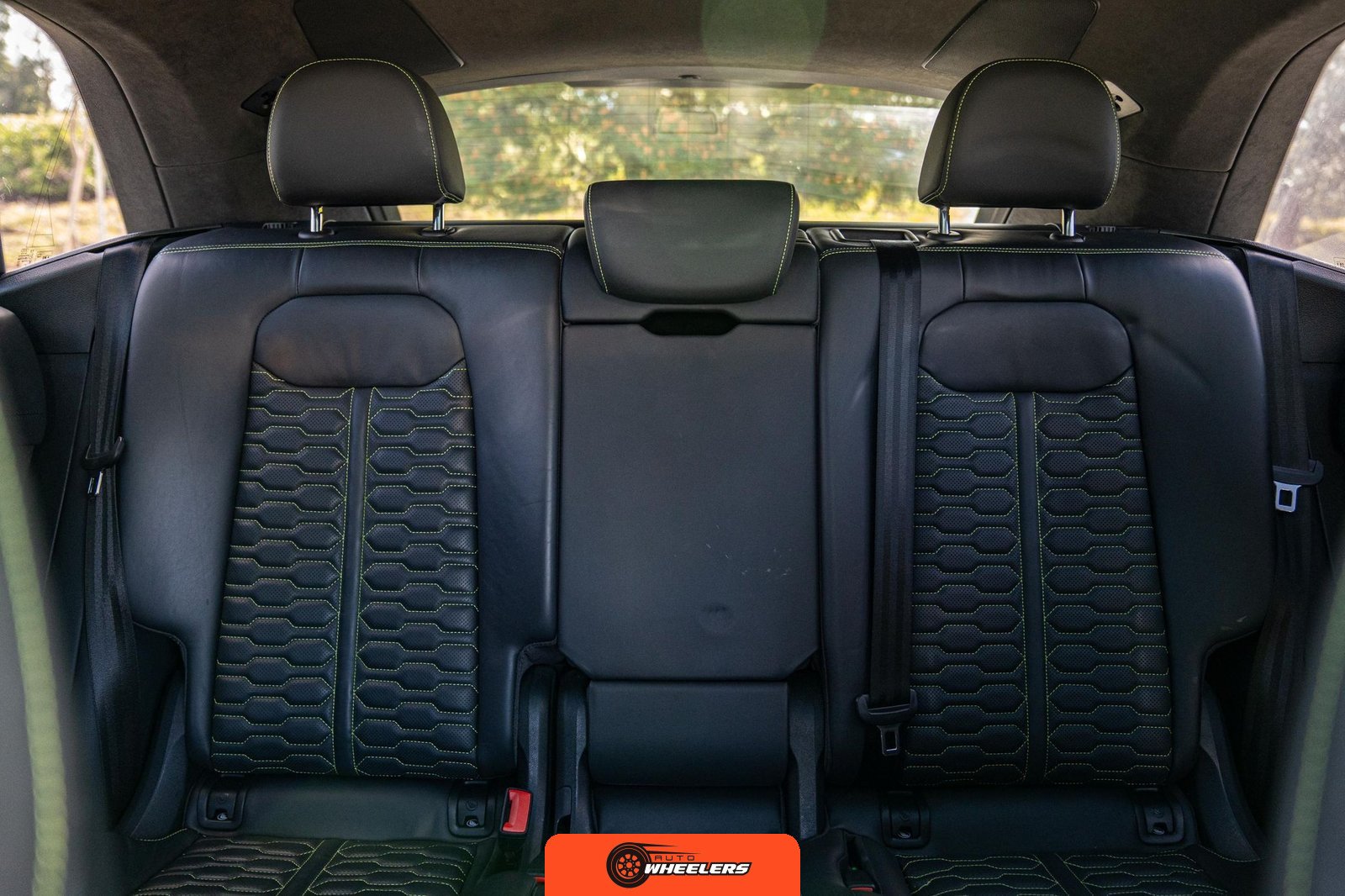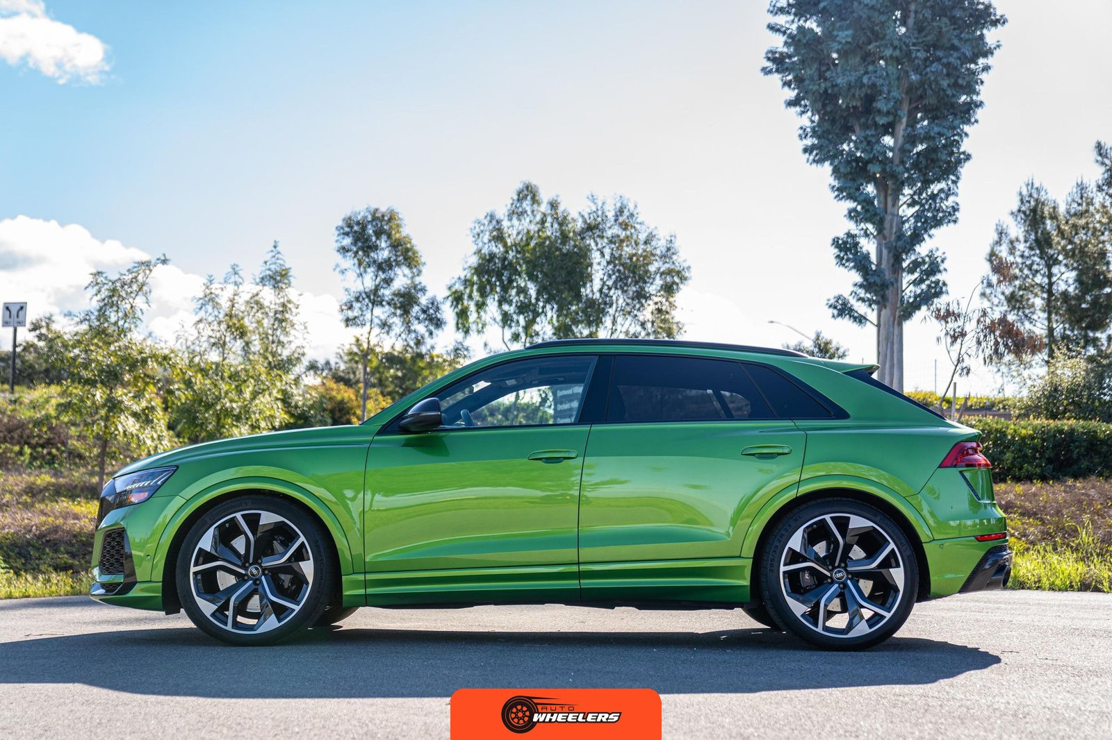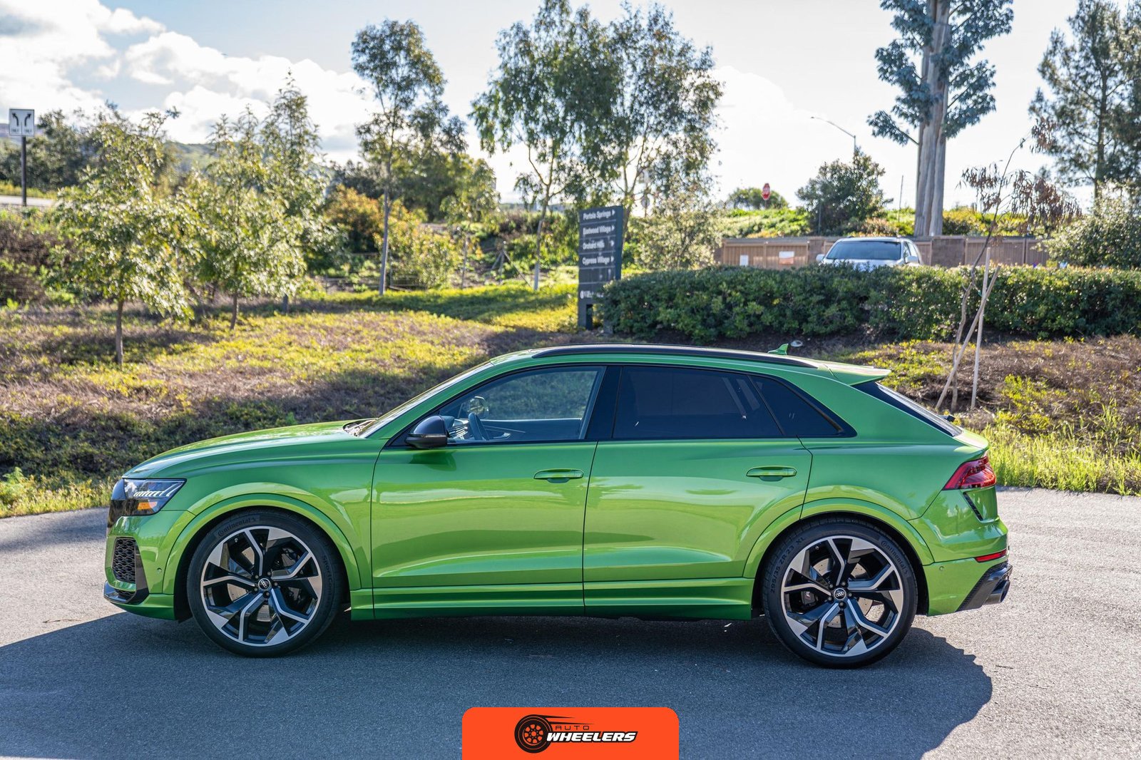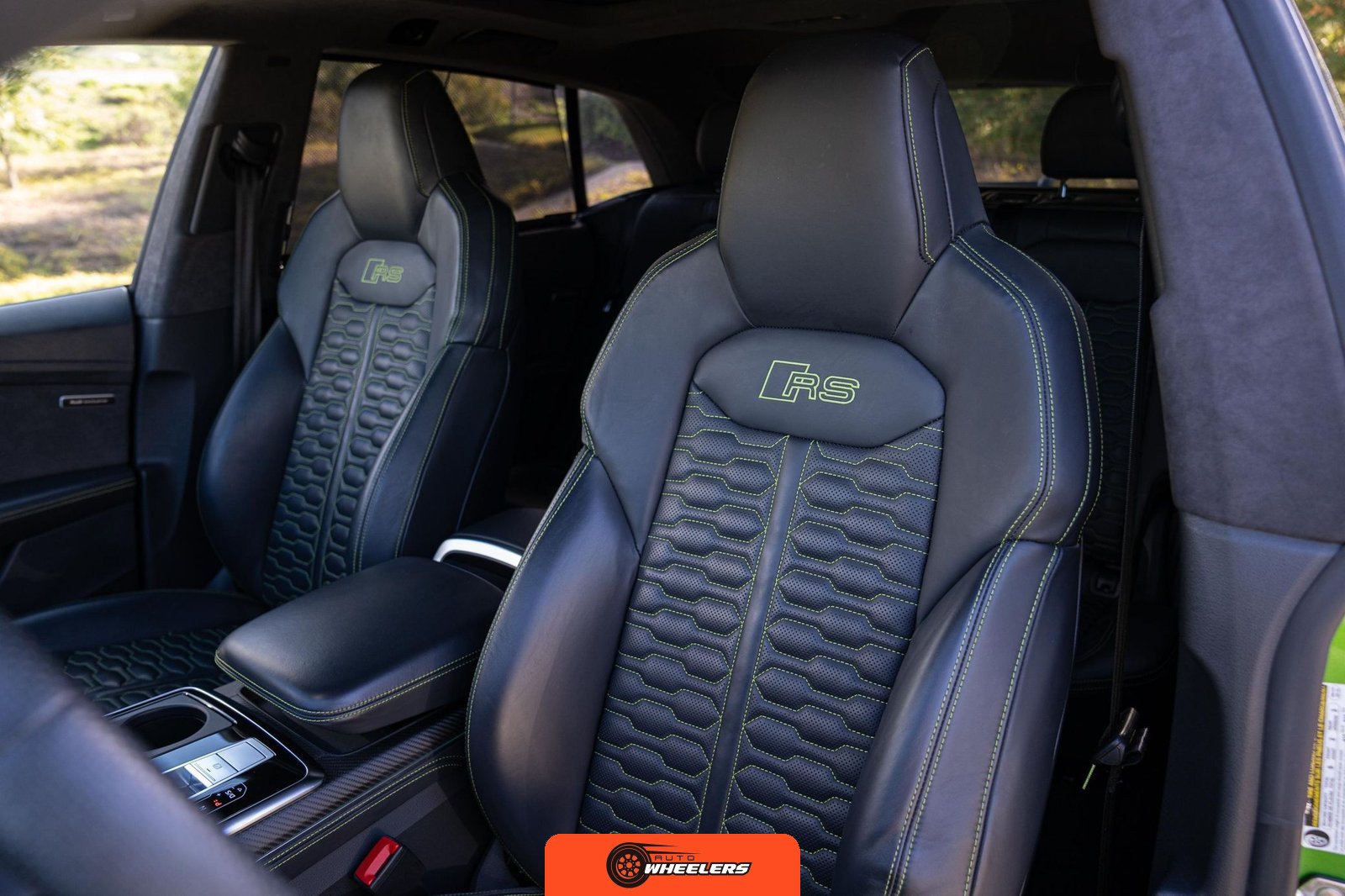 The exterior of this RS Q8 is finished in Audi Exclusive Java Green, a special-order color that distinguishes it from standard production offerings. The Carbon Optic Package adds carbon fiber exterior mirror caps, carbon exterior elements, and a carbon mask. The Black Optic Package contributes black Audi rings and badges, black roof rails, a black mask, high-gloss black exterior elements, and 23-inch 5-Y-spoke-rotor design anthracite wheels. A sport exhaust system is also included as part of the Black Optic Package. The post-repossession inspection noted stone chips on the front end consistent with highway use.