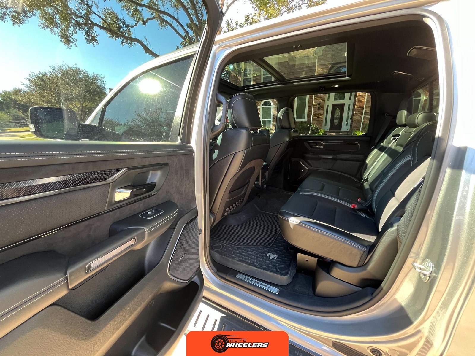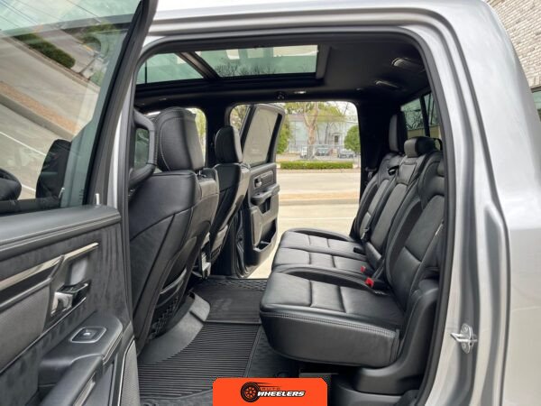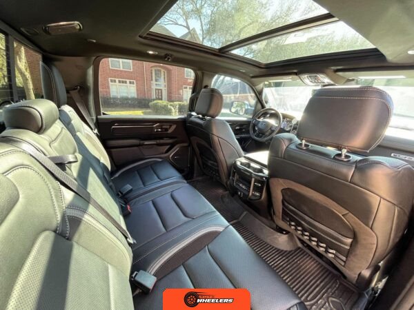Technology and convenience features include a Uconnect 12-inch infotainment system with navigation, a 7-inch driver information display, a 19-speaker Harman/Kardon audio system, full-speed adaptive cruise control, lane keep assist, pedestrian emergency braking, blind-spot monitoring with cross-path detection, front and rear park assist, rain-sensing wipers, remote start, and a power tailgate. The dual-pane panoramic sunroof provides natural light throughout the cabin. A trailer brake controller is integrated for towing applications.
