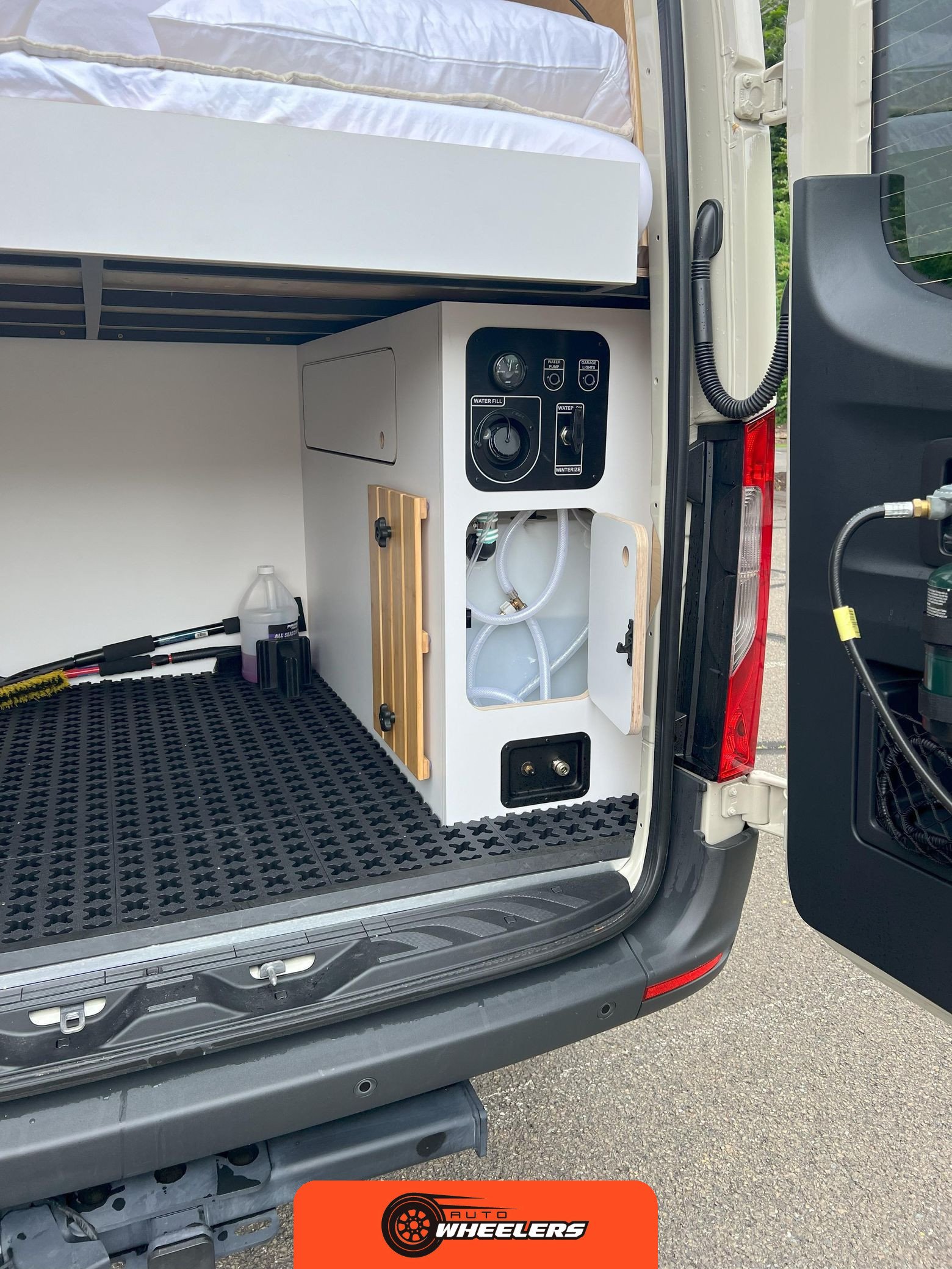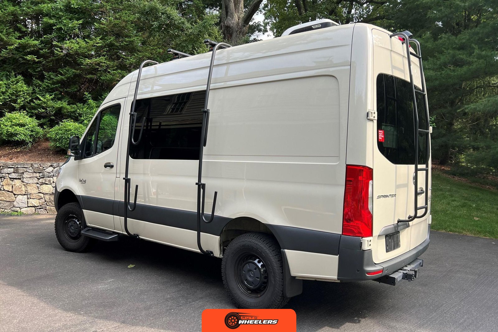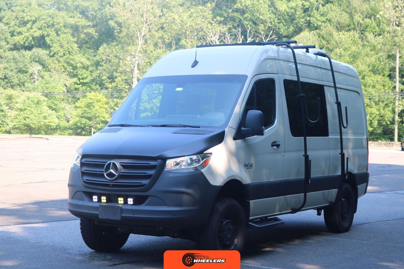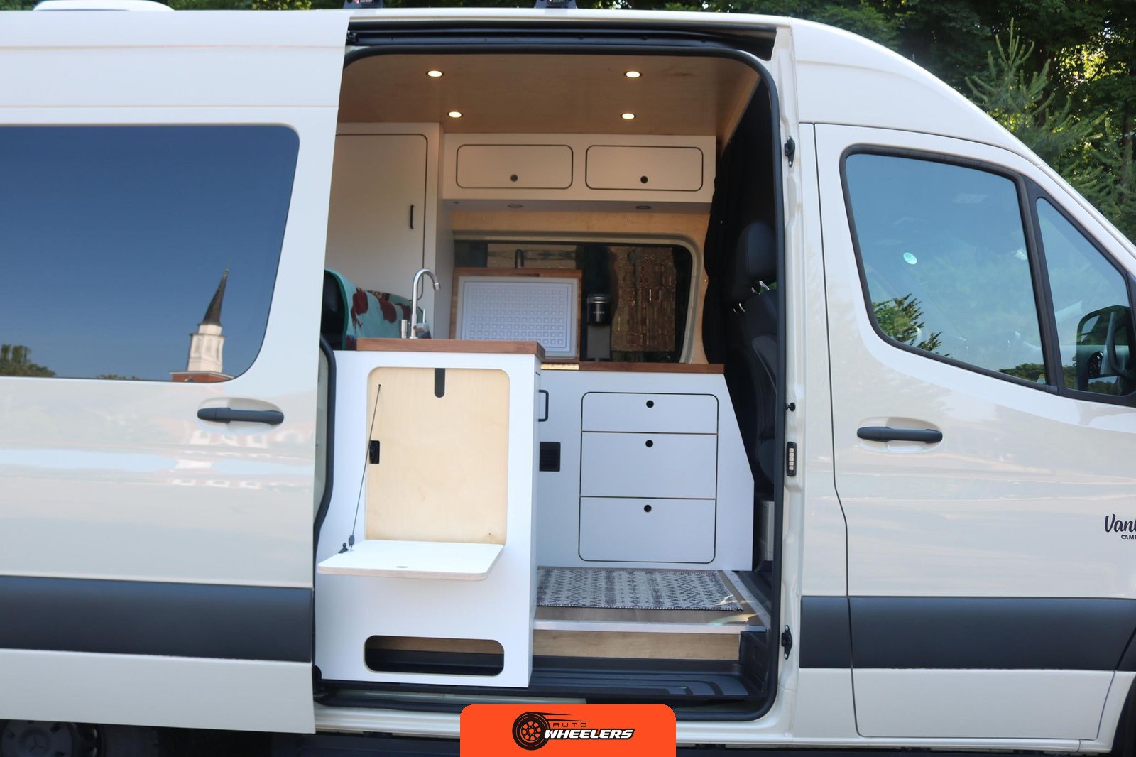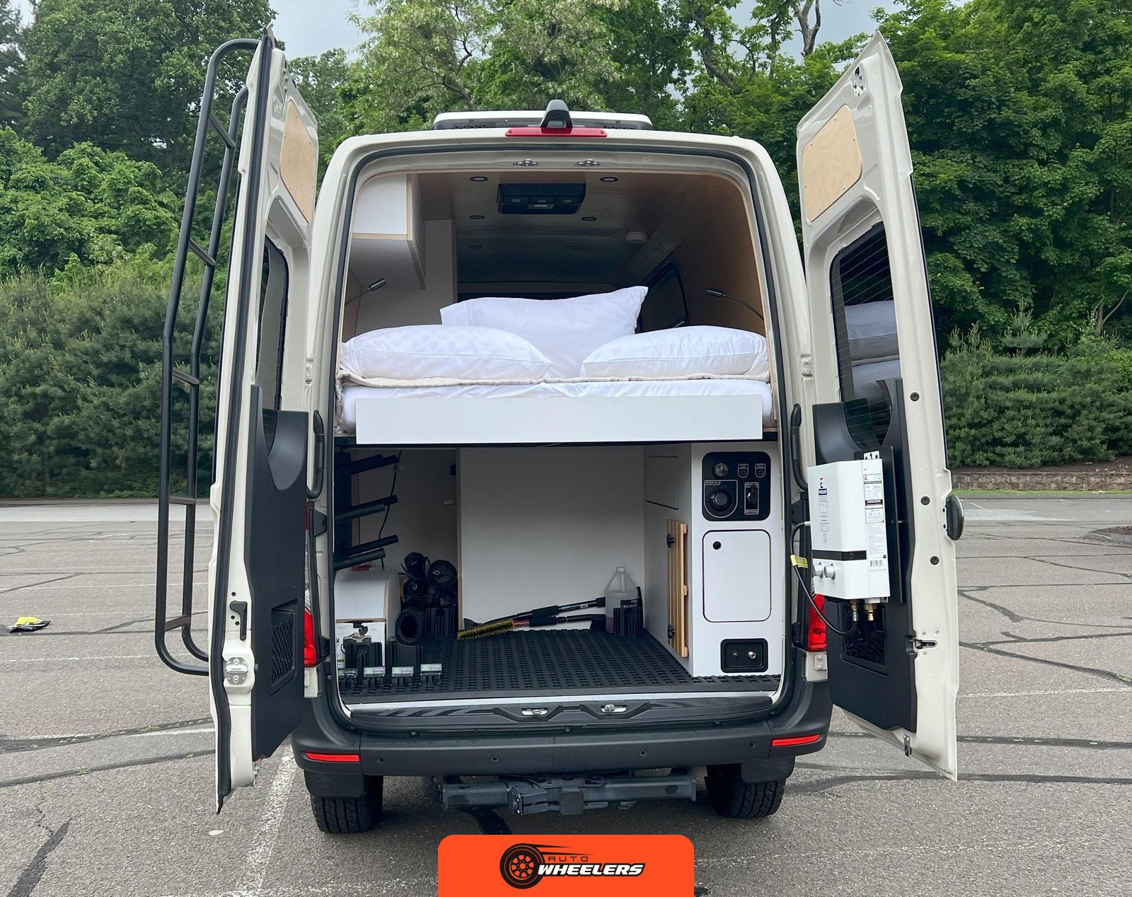 "7-inch touchscreen MBUX infotainment system", "hill-start assist technology", "blind spot monitoring system", "crosswind assist technology", "front and rear parking sensors", "360-degree camera", "four-season insulation package", "maple walls, ceilings, and door card trim", "white laminated birch cabinetry", "four overhead cabinets", "oak countertops", "pine corner boards", "weatherproof vinyl flooring", "steel bed and bench frames with two lap belts", "black leather bench cushions", "6-inch medium memory-foam bed", "black partition curtain", "Lagun table kit", "white garage cabinet kit", "air diesel heater", "rear roof vent fan", "Renogy 320-watt solar panel", "Renogy 2.4-kilowatt-hour smart-heated lithium package", "Renogy 3, 000-watt pure sine inverter", "two-stage overhead lighting with dimmer", "bedside reading light package", "stainless pressure-regulated electric sink", "45-quart refrigerator", "single-burner induction stove top", "swiveling passenger-side seat", "new cockpit carpet kit", "pegboard storage system", "garage T-Mat storage system", "Dometic RTX-2000 Off-Grid air conditioning system", "Renogy 400ah lithium smart self-heating battery upgrade", "outdoor hot water shower package", "LED lighting package", "tinted windows", "full set of window Reflectix" |