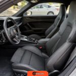 Inside, the cabin features a black interior with Adaptive Sport Seats Plus, which provide increased bolstering and adjustability compared to standard sport seats. The Carrera T deletes the rear seats as part of its weight-reduction strategy, resulting in a two-seat configuration with additional storage space behind the front seats. The interior retains Porsche’s driver-focused dashboard architecture with analog tachometer flanked by digital displays.