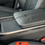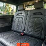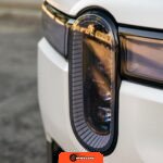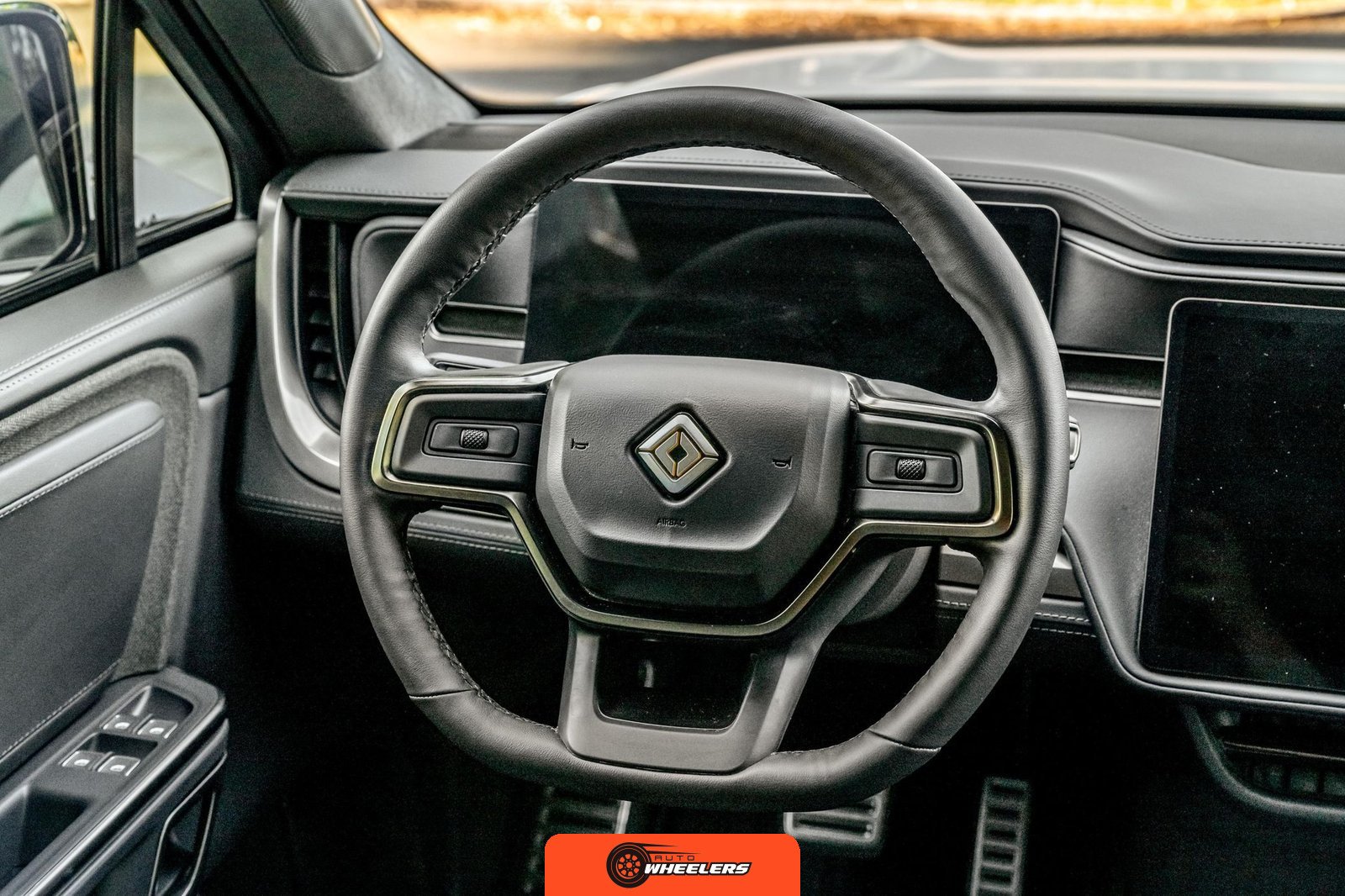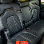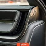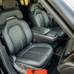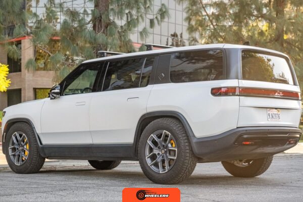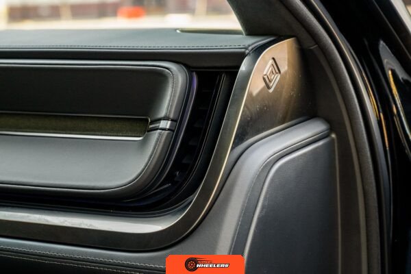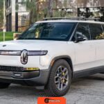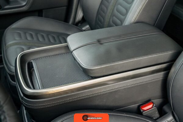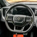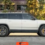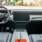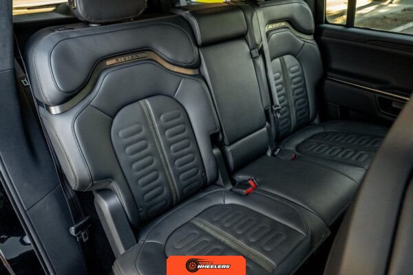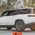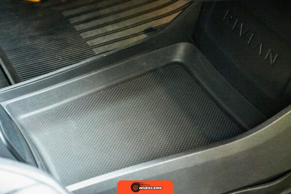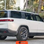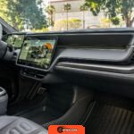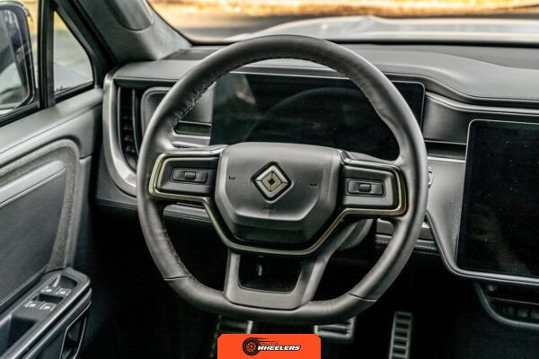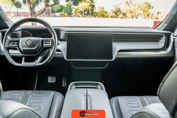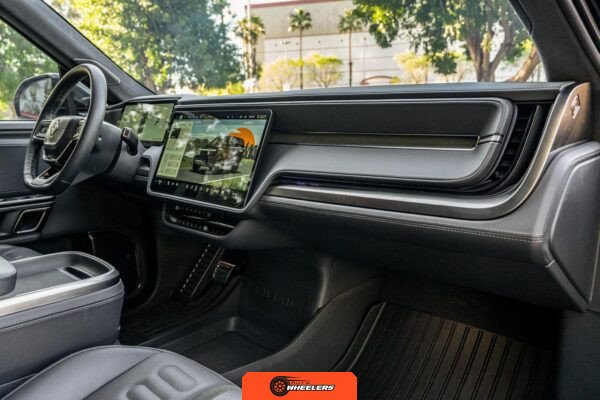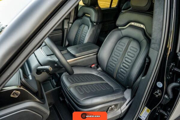 Inside, the Black Mountain interior consists of vegan leather seating surfaces across three rows, with seating capacity for up to seven occupants. The front seats feature power adjustment, heating, and ventilation functions, while the second-row seats include heating capability. The cabin layout emphasizes a driver-focused digital interface with a large central touchscreen controlling vehicle functions, climate, and infotainment systems. Materials and build quality reflect Rivian’s positioning as a premium electric vehicle manufacturer.