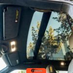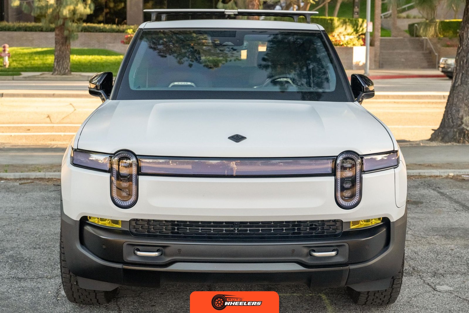 The exterior of this R1S features the distinctive Midnight factory finish beneath a white vinyl wrap applied as a modification. The Adventure Edition bodywork includes 20-inch All-Terrain wheels, LED lighting elements front and rear, and a streamlined profile characteristic of Rivian’s design language. The post-repossession inspection notes blacked-out exterior badges and yellow fog light lenses as owner modifications. Condition notes include chips on the front end and scuffs on the door sills, consistent with normal use over approximately 24,500 miles.