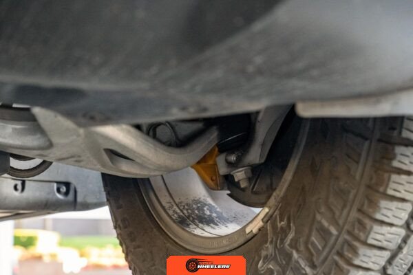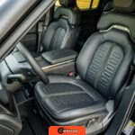 Factory equipment identified in the inspection includes 20-inch All-Terrain wheels, an air suspension system, vegan leather upholstery, heated and ventilated front seats, heated second-row seats, and kinetic roll control. Modifications include blacked-out exterior badges and yellow fog light lenses.