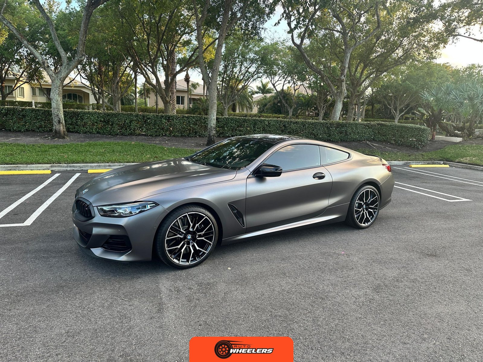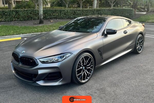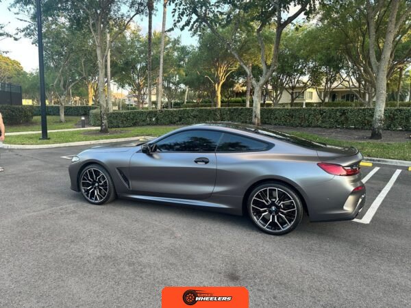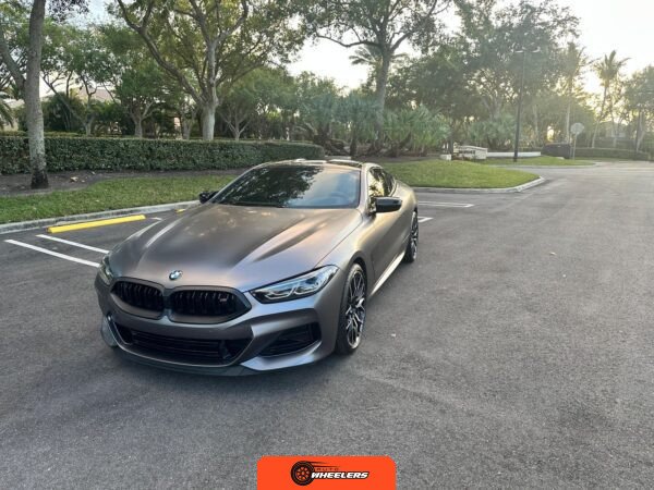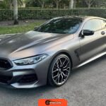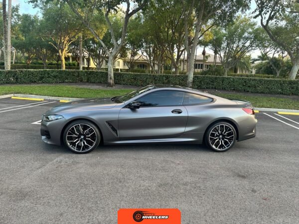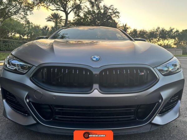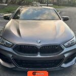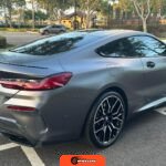 The 2025 BMW M850i xDrive Coupe represents the performance-oriented configuration within BMW’s revived G15 8 Series lineup. Reintroduced in 2019 after nearly two decades, the modern 8 Series combines sweeping coupe proportions with advanced luxury features and turbocharged powertrain technology. This example features Carbon Black factory paint beneath a professionally applied satin dark gray vinyl wrap, creating a distinctive matte appearance. The M Performance and M Aerodynamics packages contribute aggressive visual elements including M Shadowline lighting, extended Shadowline trim, a black rear spoiler, and M Sport brakes with black calipers. A carbon fiber roof panel reduces weight and lowers the center of gravity.