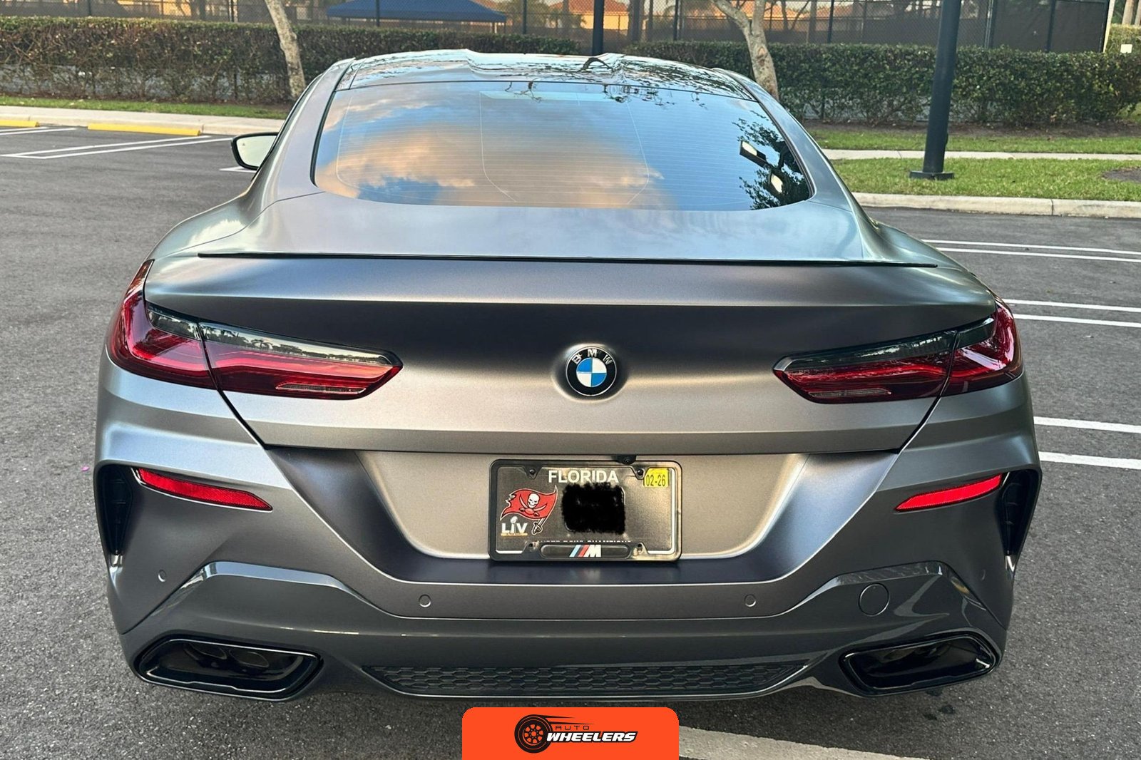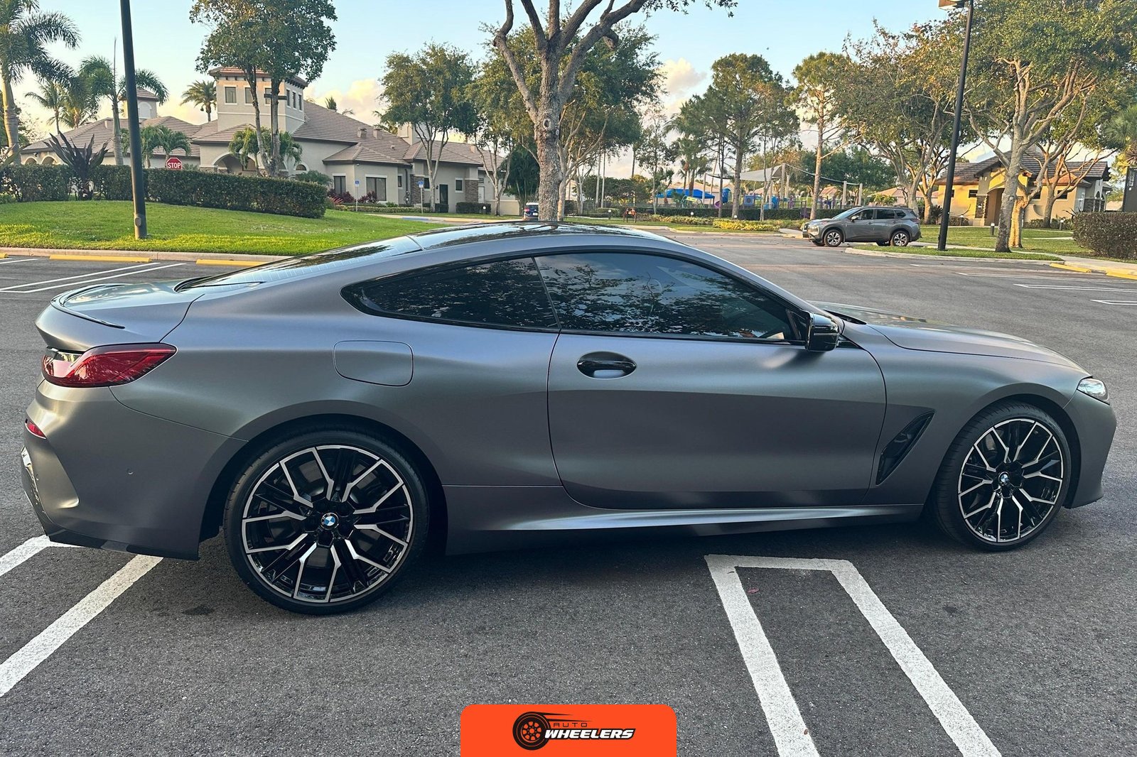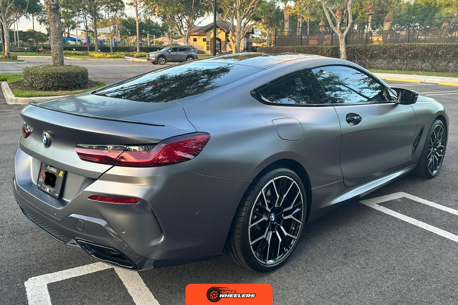The 2025 BMW M850i xDrive Coupe represents the performance-oriented configuration within BMW’s revived G15 8 Series lineup. Reintroduced in 2019 after nearly two decades, the modern 8 Series combines sweeping coupe proportions with advanced luxury features and turbocharged powertrain technology. This example features Carbon Black factory paint beneath a professionally applied satin dark gray vinyl wrap, creating a distinctive matte appearance. The M Performance and M Aerodynamics packages contribute aggressive visual elements including M Shadowline lighting, extended Shadowline trim, a black rear spoiler, and M Sport brakes with black calipers. A carbon fiber roof panel reduces weight and lowers the center of gravity.