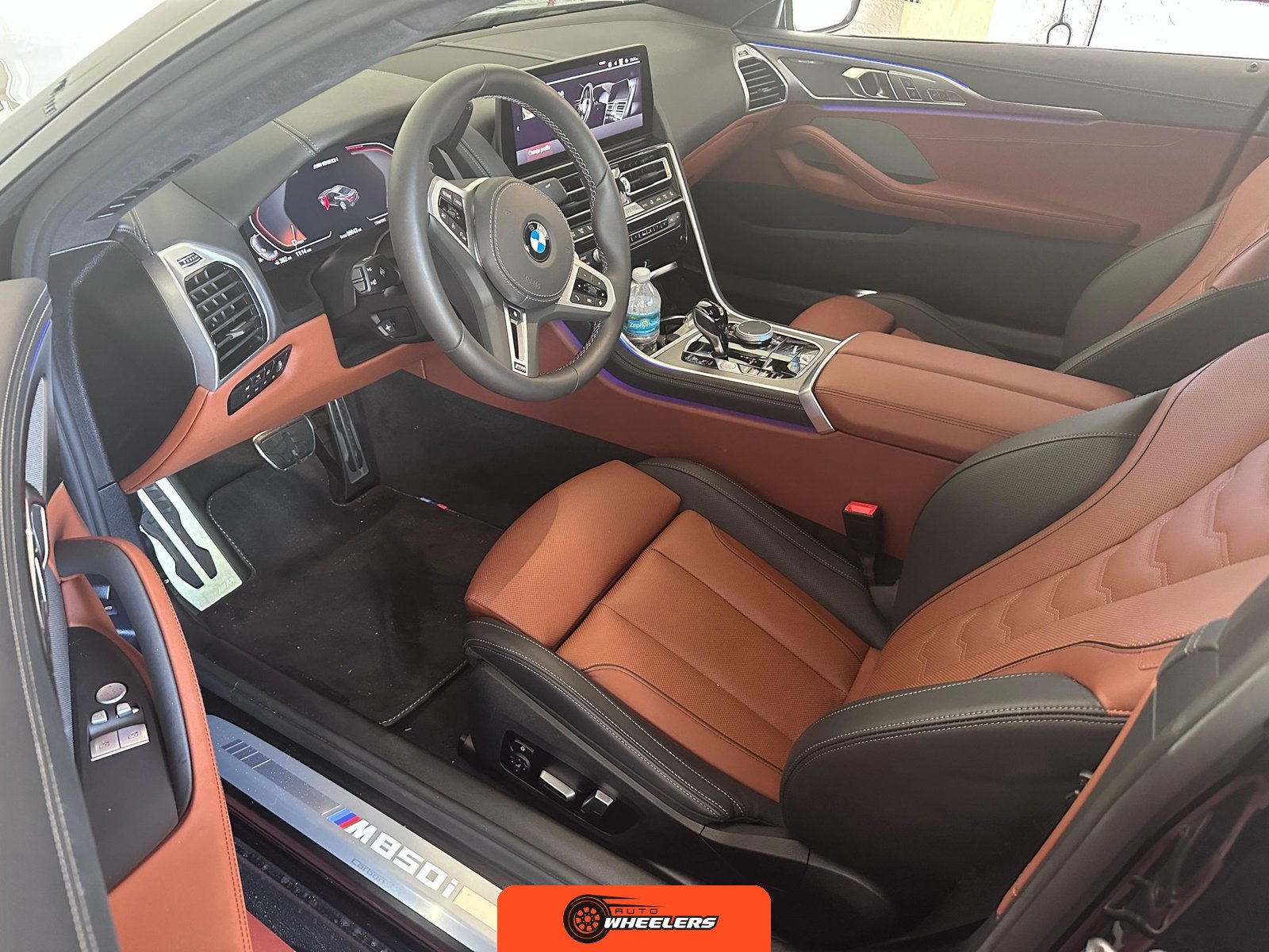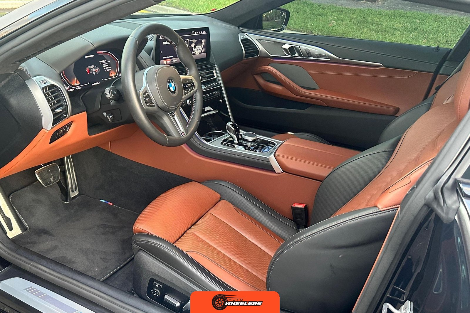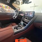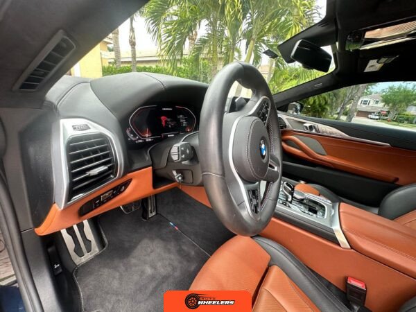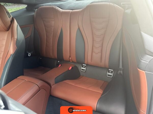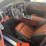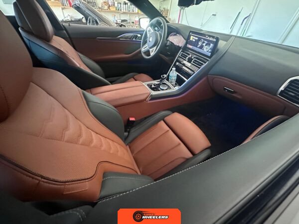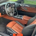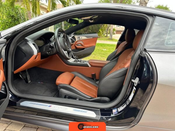 The interior showcases a dual-tone Tartufo and black color scheme with an Alcantara headliner. Seating surfaces feature both heating and ventilation functionality in the front positions. The Front Heat Comfort Package adds heated armrests and a heated steering wheel. Soft-close door technology is present throughout. The cabin layout follows BMW’s driver-focused design philosophy with contemporary digital interfaces and premium materials consistent with the 8 Series positioning.
